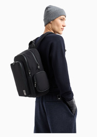Double-compartment backpack with zip, side pockets, breathable mesh back and practical padded, adjustable shoulder straps. A compact accessory with ample capacity for short business trips. The Travel Essential AW24 selection is defined by a focus on practicality and style for even more function and sophistication: the essential lines, compact volumes, organised interiors and nylon construction define a line of accessories designed both for travel and city life. Each product comes with a rubberised patch with a dedicated logo. Product Code: EM000087AF104301UC001 Details Composition 88% Polyamide 12% Elastane Measurements: 30 x 40 x 15 cm Nylon Collection patch Zip closure Multiple compartments Padded shoulder straps Breathable mesh back Straps to join around the waist