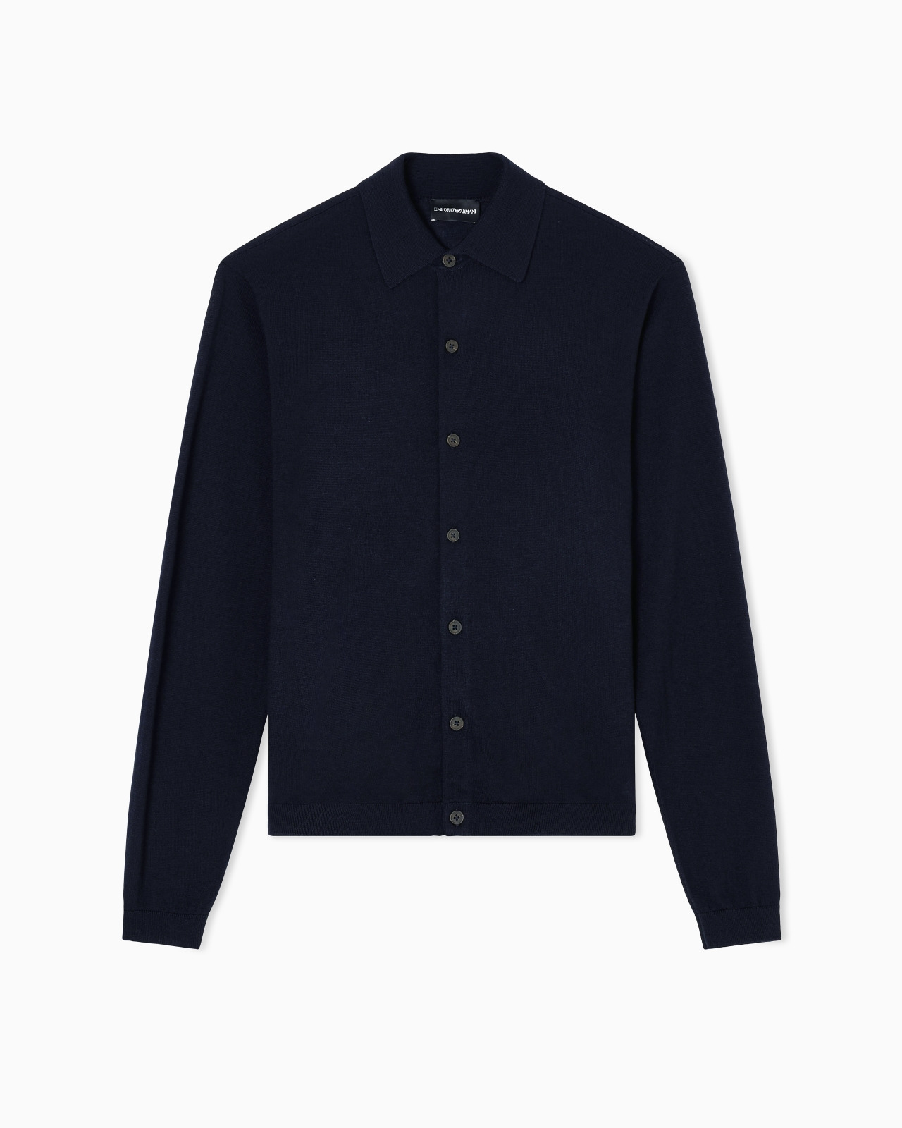 Cardigan with a classic collar and front buttoning, made of pure virgin wool in a plain knit. The piece belongs to the Travel Essentials Autumn/Winter 2025 capsule collection. Plain knit Classic collar Front buttoning Long sleeves Rib-knit cuffs and hem Collection logo patch on the back Product Code: EM001959AF14114UB118