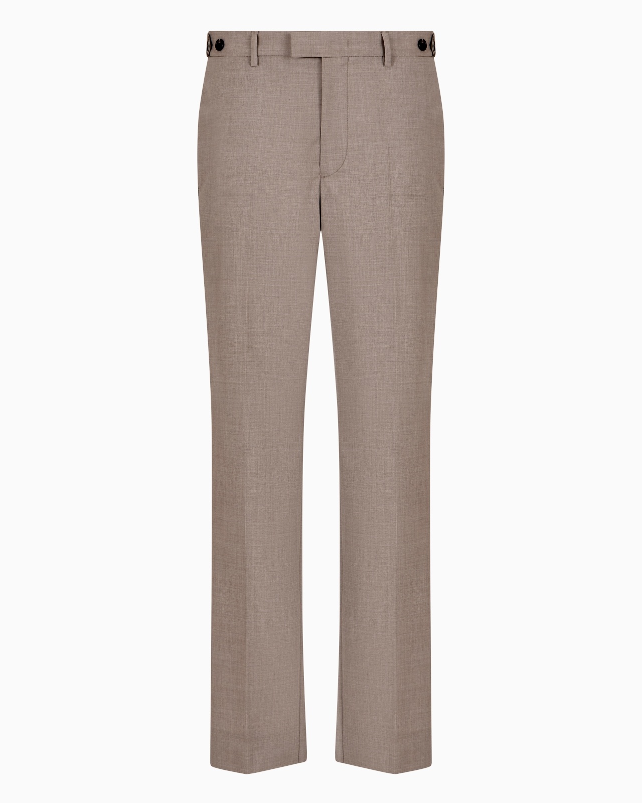 Trousers with front pleat with buttoned faux waist-adjuster details at the sides. The item is made of pure virgin wool canvas, an extremely fresh, sophisticated fabric. The classic, formal design of the suit blends with the freshness of the fabric used. Light wool Waist with belt loops Strap detail at the sides Zip, hook and button closure Side inseam pockets Front pleat Back double welt pocket Product Code: EM000275TE13640O1003