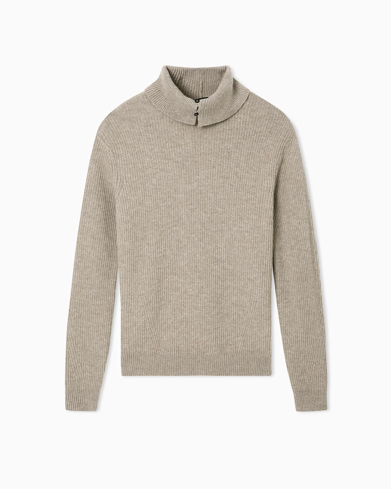 Jumper featuring a wide turned down turtleneck with buttons and buttonholes. The garment, made of a virgin wool blend with a small percentage of cashmere that adds softness and a touch of luxury, features a traditional half fisherman’s rib. Fineness: 7 Half fisherman’s rib knit Buttoned mock neck Ribbed trim Product Code: EM004456AF24490U1145