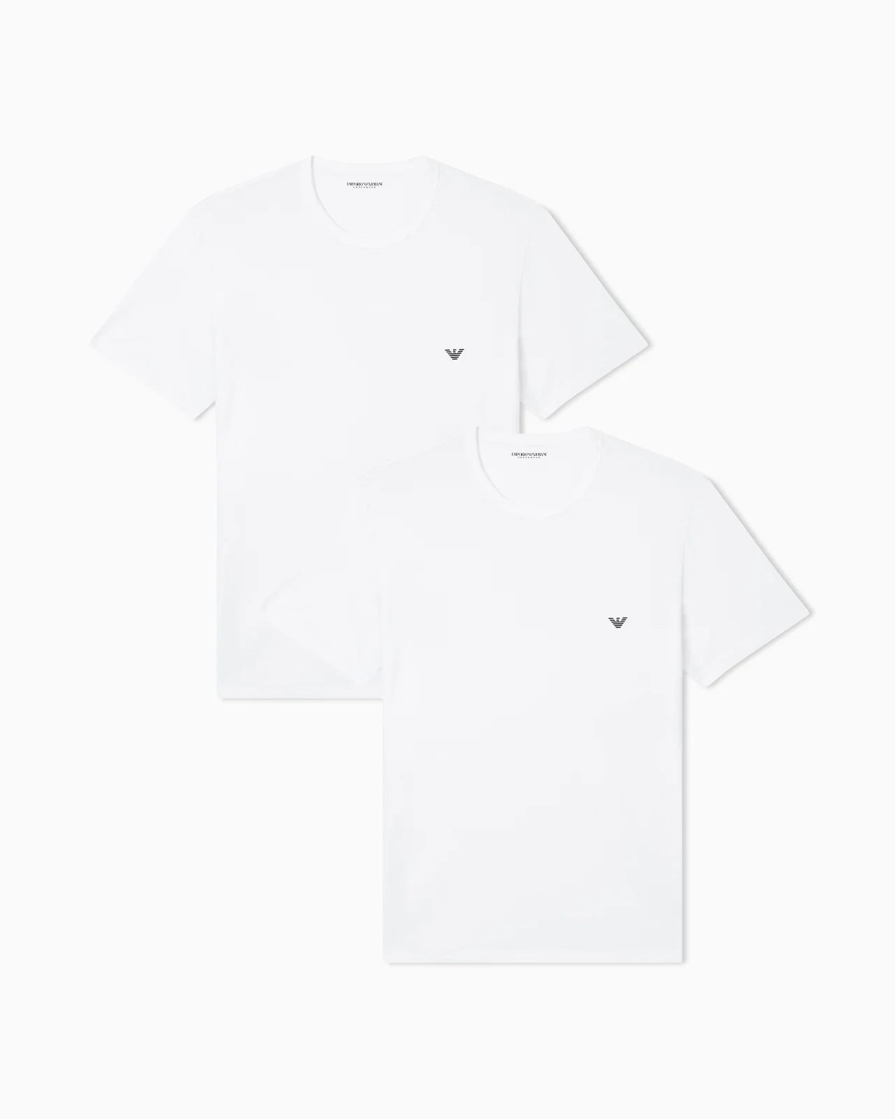 Two-pack of crew-neck T-shirts in stretch cotton jersey. Contrasting micro eagle on the chest. This item belongs to the Essentials clothing selection, the Emporio Armani capsule collection that is designed for a wardrobe that meets the demands of any season. These “essential”, versatile pieces are a must-have for the male wardrobe. Regular fit Two-pack Stretch jersey Crew neck Front micro eagle Short sleeves Product Code: EM000391AF14132M0082