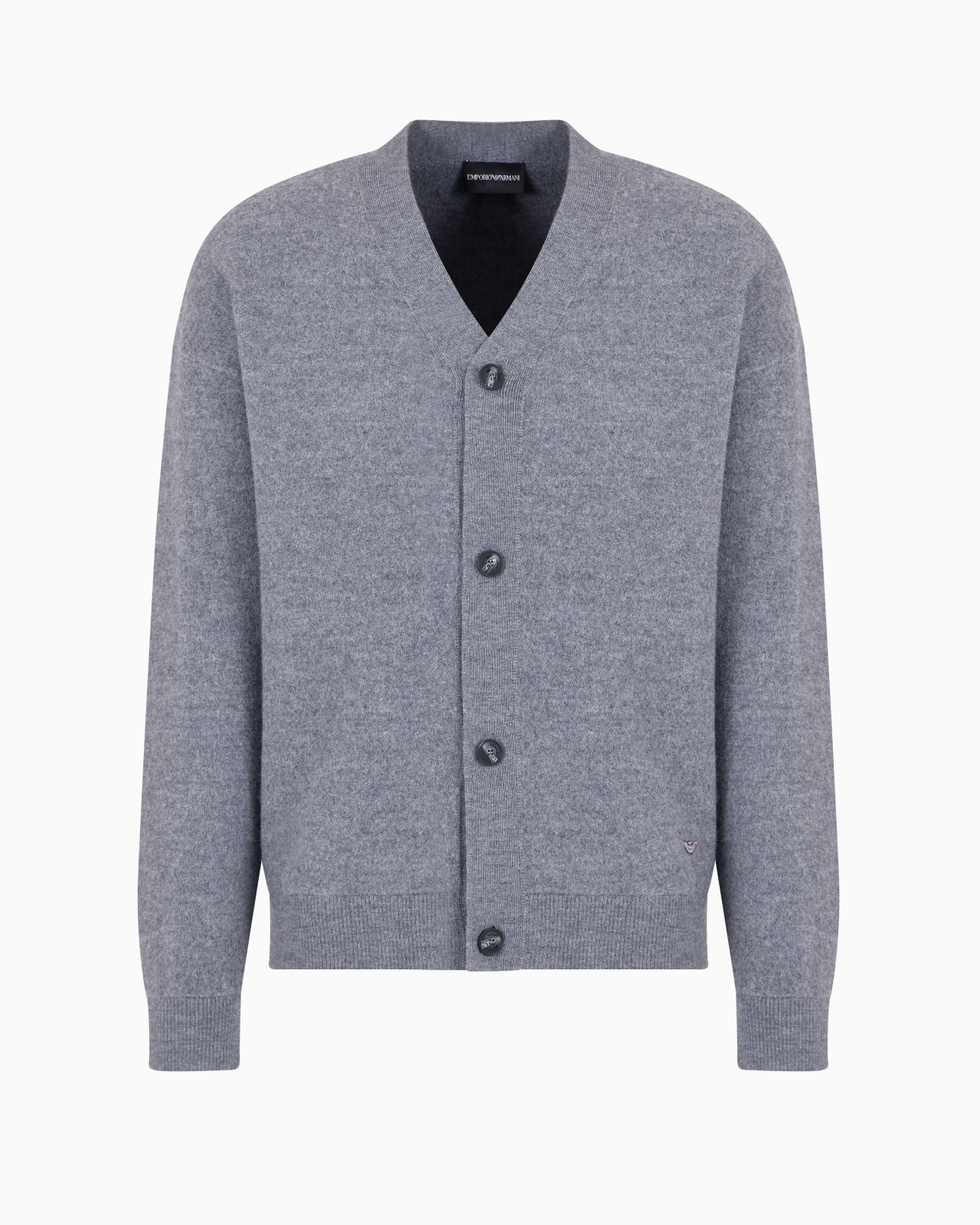 V-neck cardigan with front button closure. Made of a pure virgin wool knit with a compact jersey-fleece texture. Product Code: 6D1MX61MJEZ10631 Details Composition 100% Virgin Wool Fineness: 12 Compact knit V neck Button closure Long sleeves Ribbed cuffs and hem Fitting The model is 188 cm tall and is wearing size 48/M (Italian Size)