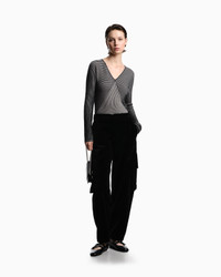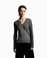 V-neck jumper with long sleeves, in a fabric with a soft feel due to a small percentage of cashmere content. The style features a dense weave of links stitches alternating with a vertical striped jacquard motif, creating a two-tone effect. Link stitch Jacquard Striped design V neck Long sleeves Made in Italy Product Code: EW002744AF20460FC102
