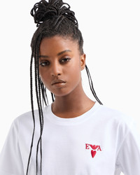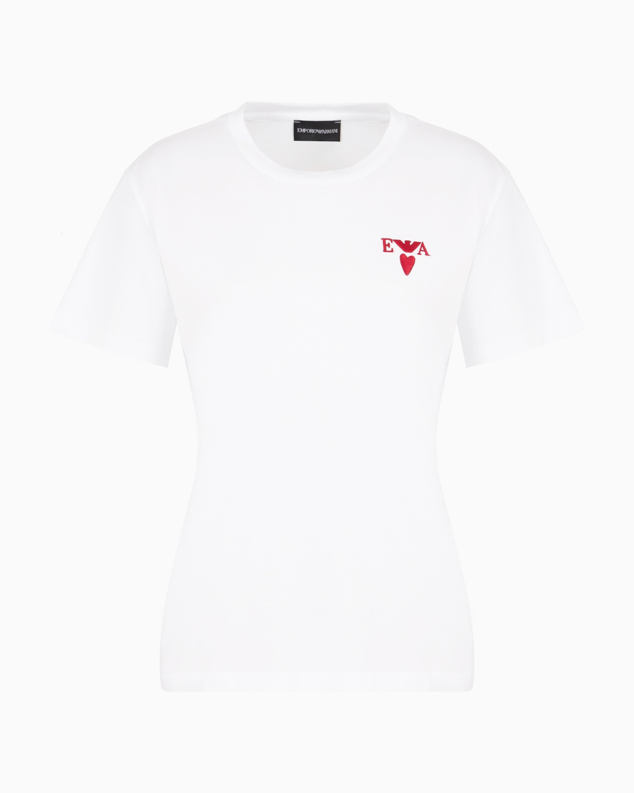 Crew-neck T-shirt made from high-quality mercerised cotton for added sheen, durability and breathability. Collection embroidery on the chest. A tribute to the day of love and lovers: the contrasting red graphic designs embellish ready-to-wear clothing and accessories from the Valentine’s Day capsule collection, the Emporio Armani collection that celebrates love. Product Code: EW000202AF100031U0002 Details Composition 100% Cotton Mercerised jersey Crew neck Short sleeves Collection embroidery Fitting The model is 178 cm tall and is wearing size 40/S (Italian Size)
