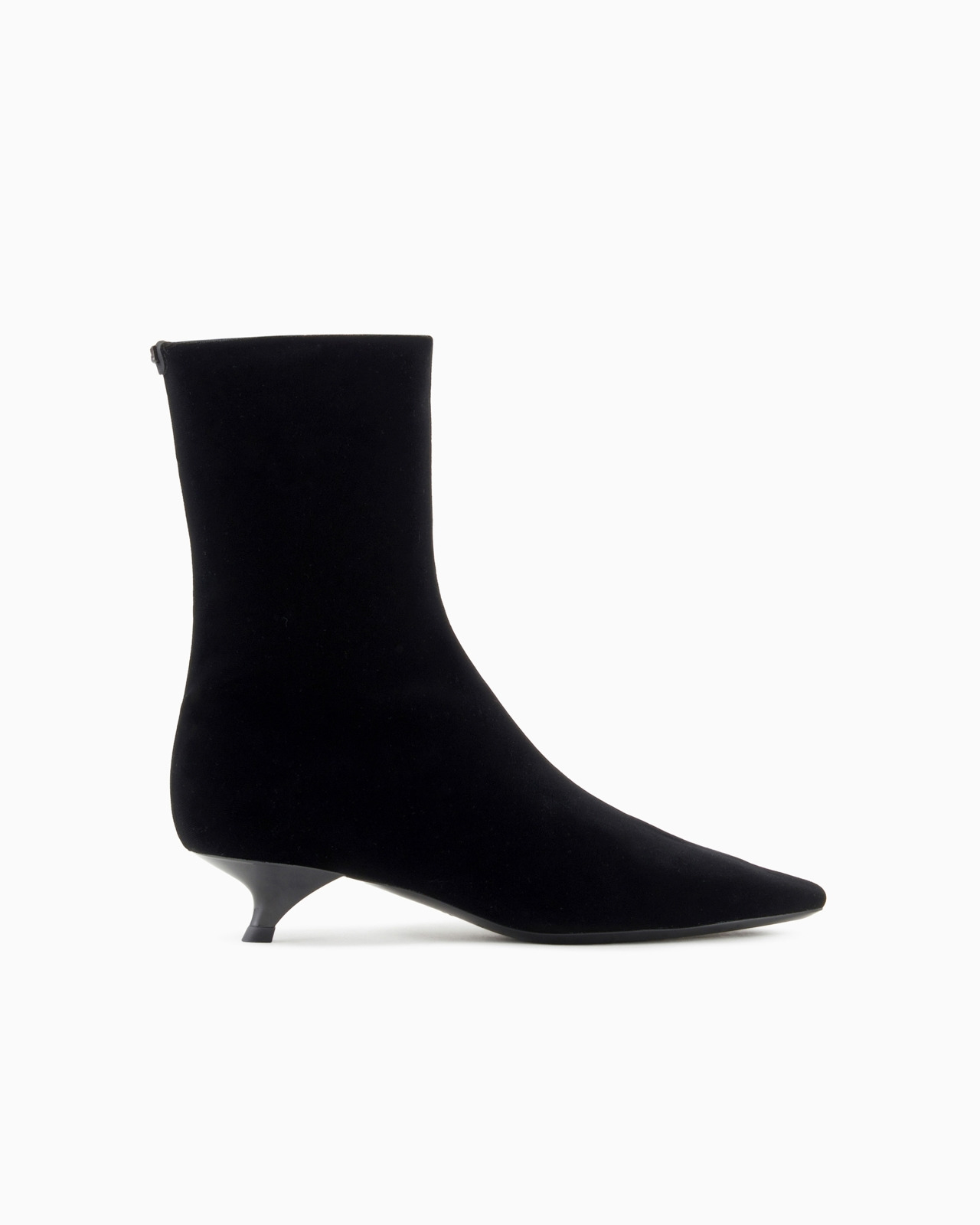 Velvet ankle boots with a tapered toe and kitten heel. A flexible leather sole makes these ankle boots particularly comfortable. A line of footwear featuring an essential and extremely modern design. Product Code: X3N188XD117100002 Details Composition 75% Viscose 25% Cupro Heel height: 3.5 cm Velvet Pointed toe Kitten heel Leather soles Made in Italy