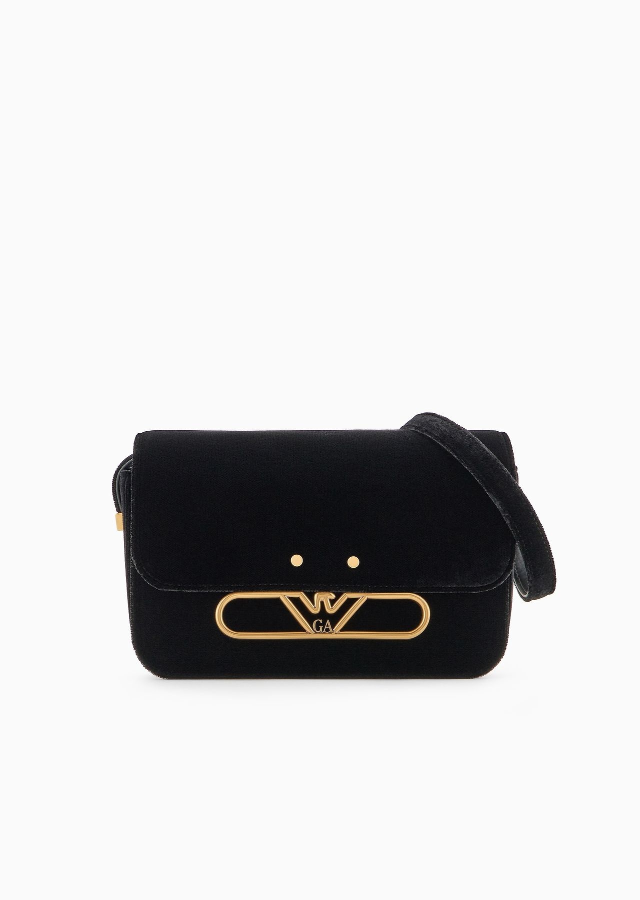 Shoulder bag made of plush smooth velvet, with a flap closure and distinctive front logo. A new line of bags featuring a monogram logo with the iconic eagle that embellishes and adds light to the accessory. Product Code: Y3E251YZB8W180001 Details Composition 65% Viscose 35% Cupro Measurements: 21 x 13 x 5 cm Velvet Adjustable shoulder strap Flap fastening Eagle logo
