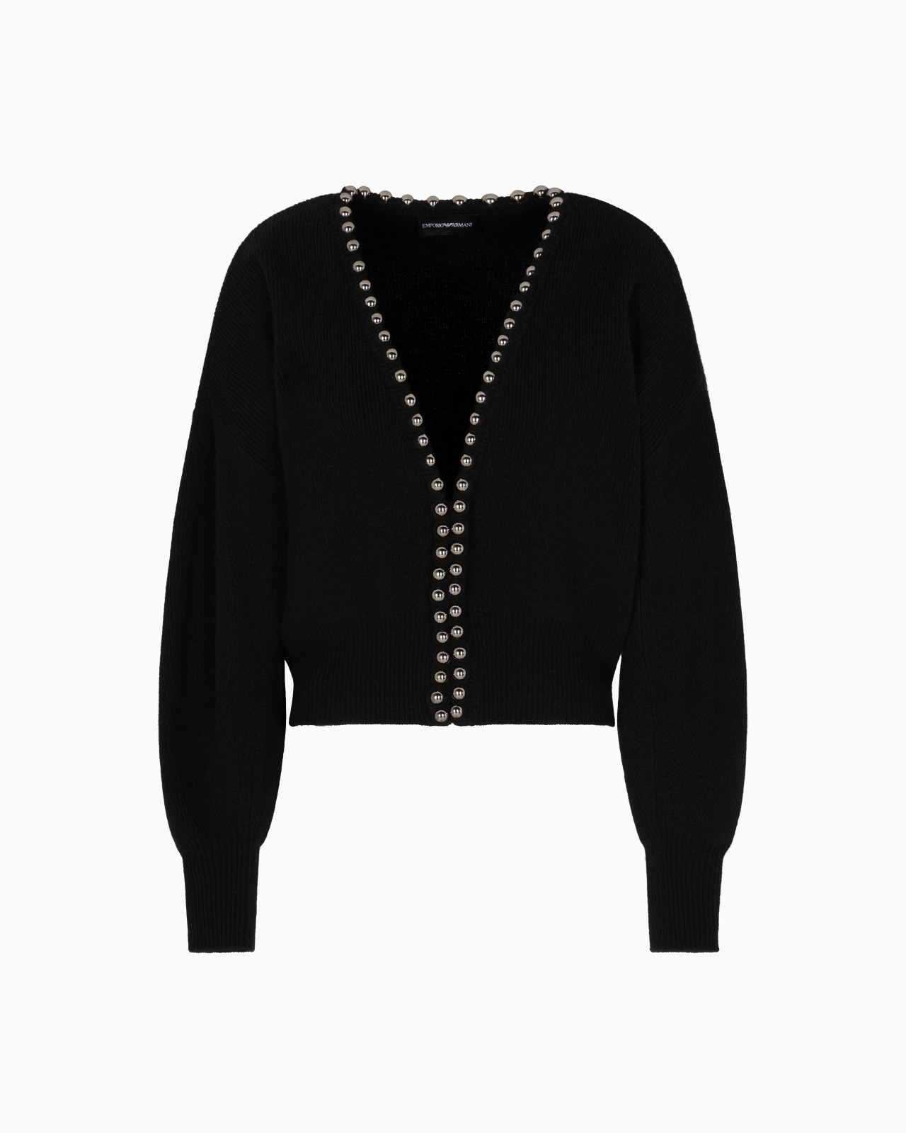 Puff-sleeved cardigan made from virgin wool and cashmere. The piece features a plain-knit, and the edge of the front V neckline is embellished with oversized metal spheres. Plain knit V neck Oversized spheres detail Hook clasp Long puffed sleeves Ribbed trim Product Code: EW001220AF19917UC001