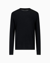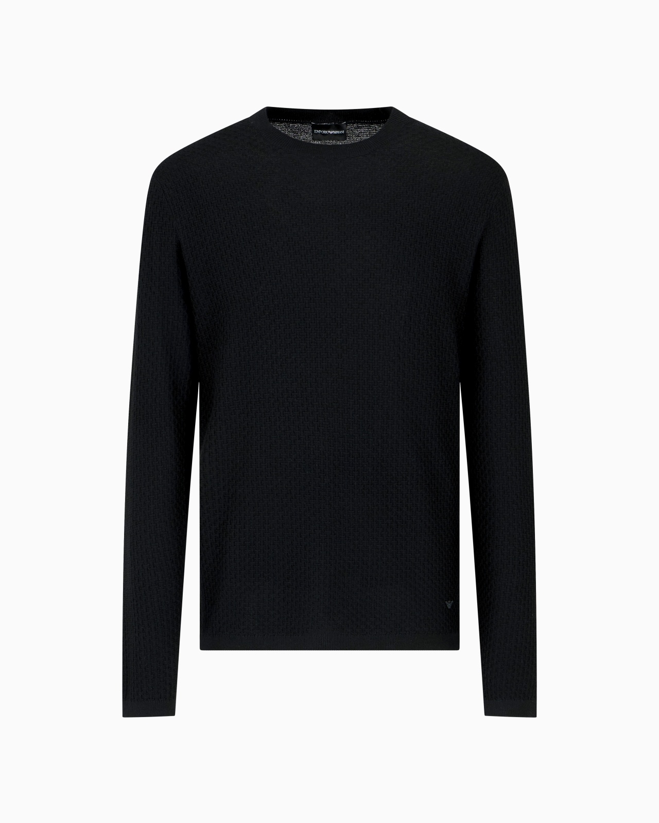 Crew-neck jumper made of pure virgin wool with a particularly tactile texture, with an embossed jacquard pattern that creates a natural intersection of structured and sophisticated motifs all over. Rib-knit cuffs and hem. Fineness: 14 Jacquard Embossed pattern Crew neck Long sleeves Rib-knit cuffs and hem Micro-eagle embroidered at the left hem Product Code: EM000883AF13851FC104