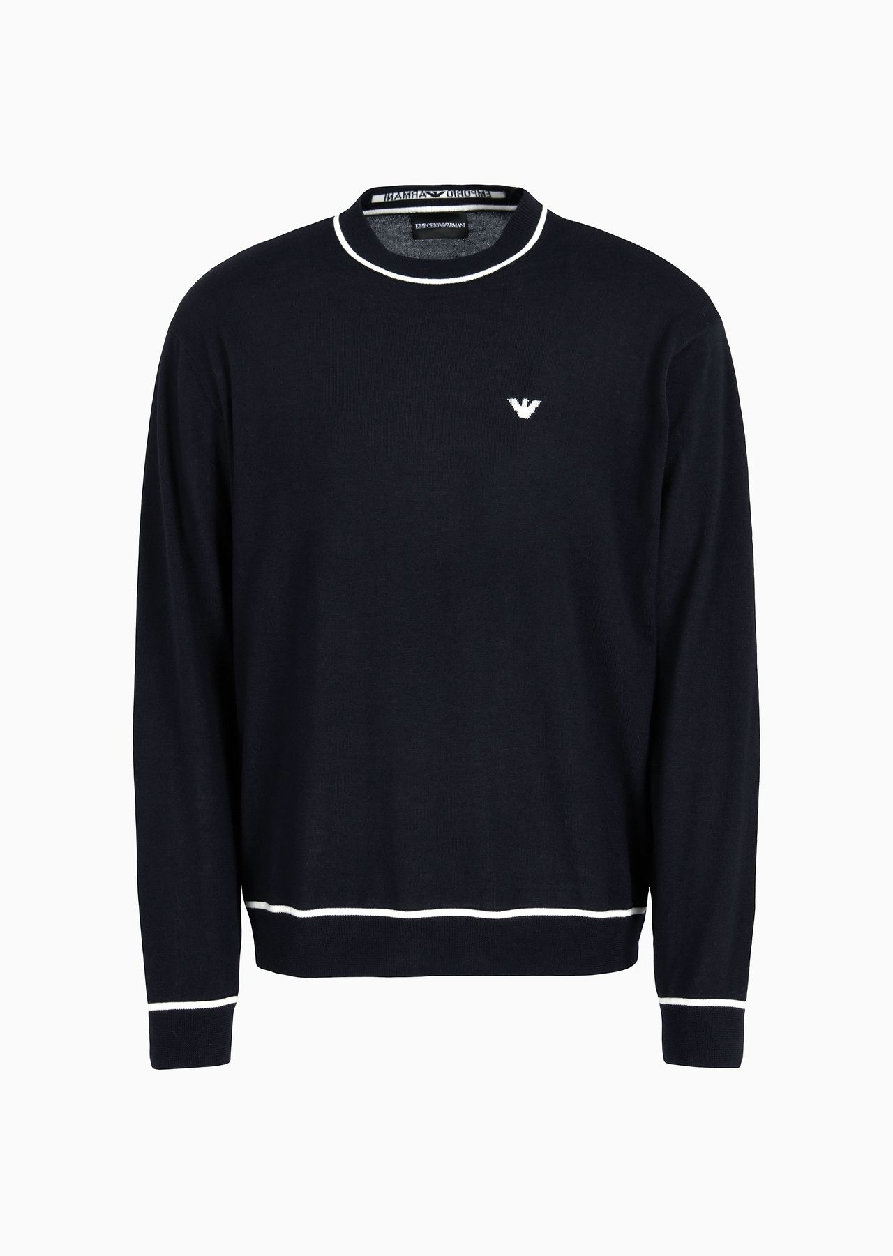 Crew-neck jumper in pure virgin wool, featuring a jacquard logo detail: depending on the style, there is either logo lettering is on the back neck trim or a two-tone eagle logo on the chest. Product Code: 6D1MXH1MJLZ1F930 Details Composition 100% Virgin Wool Fineness: 5 Weft in knit Crew neck Long sleeves Ribbed trim Jacquard logo Fitting The model is 188 cm tall and is wearing size 48/M (Italian Size)