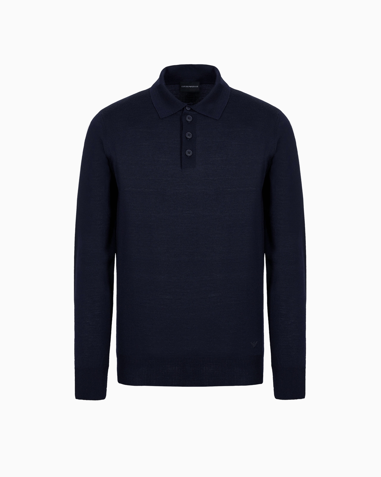 Pure virgin wool jumper with polo-shirt style collar. As practical as a jumper and as casual as a polo shirt: two wardrobe staples are combined to create this plain-knit, virgin-wool jumper. Ribbed trim and an embroidered iconic eagle at the hem complete the style. This item belongs to the Essentials clothing selection, the Emporio Armani capsule collection that is an evergreen statement of style: an ongoing collection with clean, well-designed shapes for a wardrobe that meets the demands of any season. These “essential”, versatile pieces are a must-have for the male wardrobe. Product Code: 8N1F431M67Z10922 Details Composition 100% Virgin Wool Fineness: 14 Plain knit Polo-shirt collar Partial closure with buttons Long sleeves Ribbed cuffs and hem Made in Italy Fitting The model is 188 cm tall and is wearing size 48/M (Italian Size)