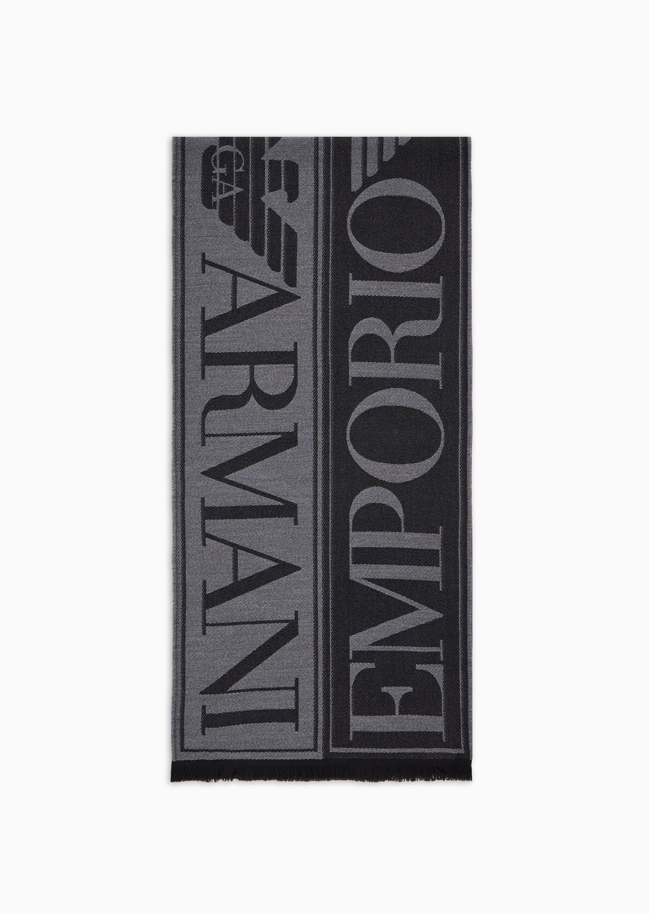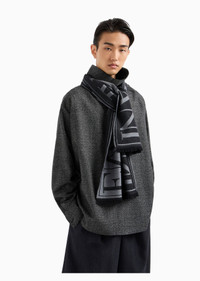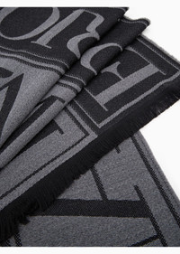 Scarf made of pure virgin wool, featuring oversized jacquard-weave logo lettering. Product Code: 6250214F322100321 Details Composition 100% Virgin Wool Virgin wool Jacquard Oversized lettering Fringed hem Made in Italy