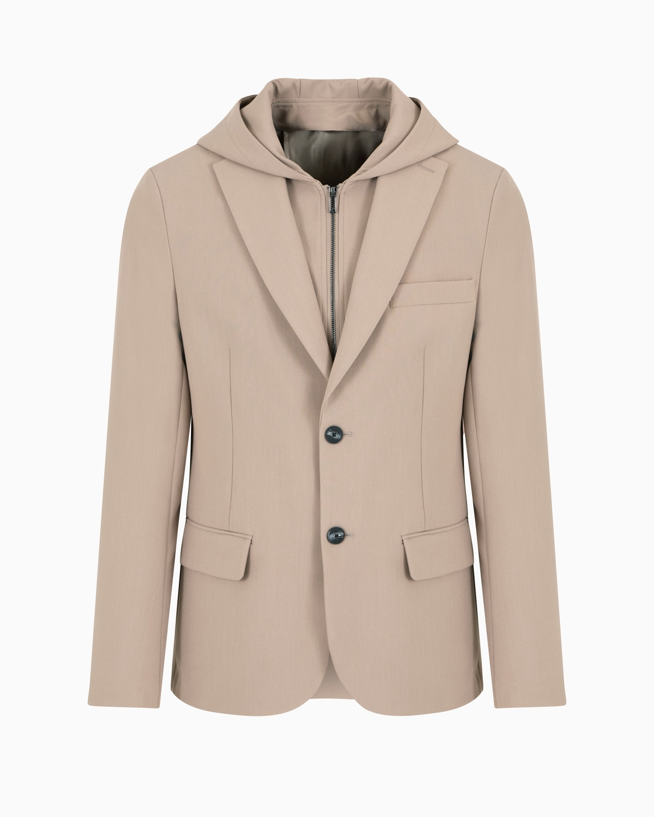 Single-breasted blazer with lapel collar and pocket-square pocket, made of a soft viscose-blend fabric. Dual-styling is offered thanks to the hood and zip-removable internal bib front, allowing it to be worn on many different occasions depending on the look you want to create. The convenience of a city jacket yet versatile and functional for all your activities in the town or countryside. Product Code: 6D1GA41NFTZ10144 Details Composition 72% Polyester 21% Viscose 7% Elastane Lapel collar Single-breasted closure Pocket-square pocket Side flap pockets Detachable inner panel with zip Long sleeves Button cuffs Fitting The model is 188 cm tall and is wearing size 48/M (Italian Size)
