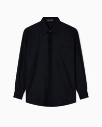Sophisticated shirt made from virgin Viyella wool, a cosy, warm English fabric, that feels light and brushed with a twill weave. The front patch on the placket depicts an unusual zig-zag motif that makes the piece more sophisticated. Viyella Classic collar Concealed front button closure Zig-zag patch on the placket Patch pocket on the chest Long sleeves Straight buttoned cuffs Product Code: EM003637TE17274UC001