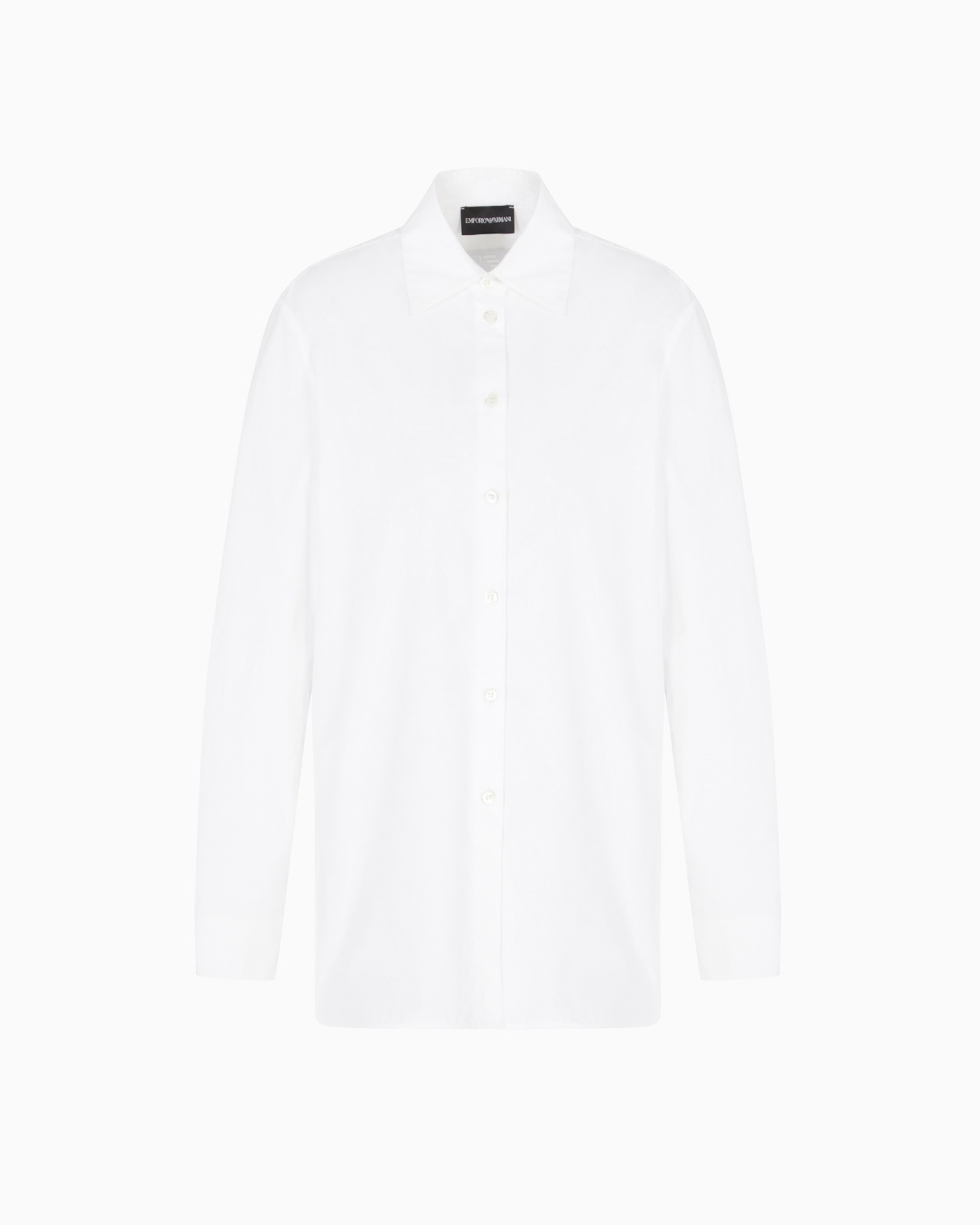 Polished pure cotton oversized shirt with classic collar. The pleat at the back created by the darts accentuates the volume of the piece, adding character as soon as you wear it. The piece belongs to the Winter Urbanism capsule collection, a selection that reinterprets the volumes and shapes of the winter wardrobe with an essential take. The urban spirit is expressed through clean, minimalist lines, enriched by the sophistication of the materials that are snug and warm to the touch. Polished cotton Classic collar Front buttoning Long sleeves Single-buttoned cuffs Side slits Back pleat Product Code: EW002666AF12441U0002