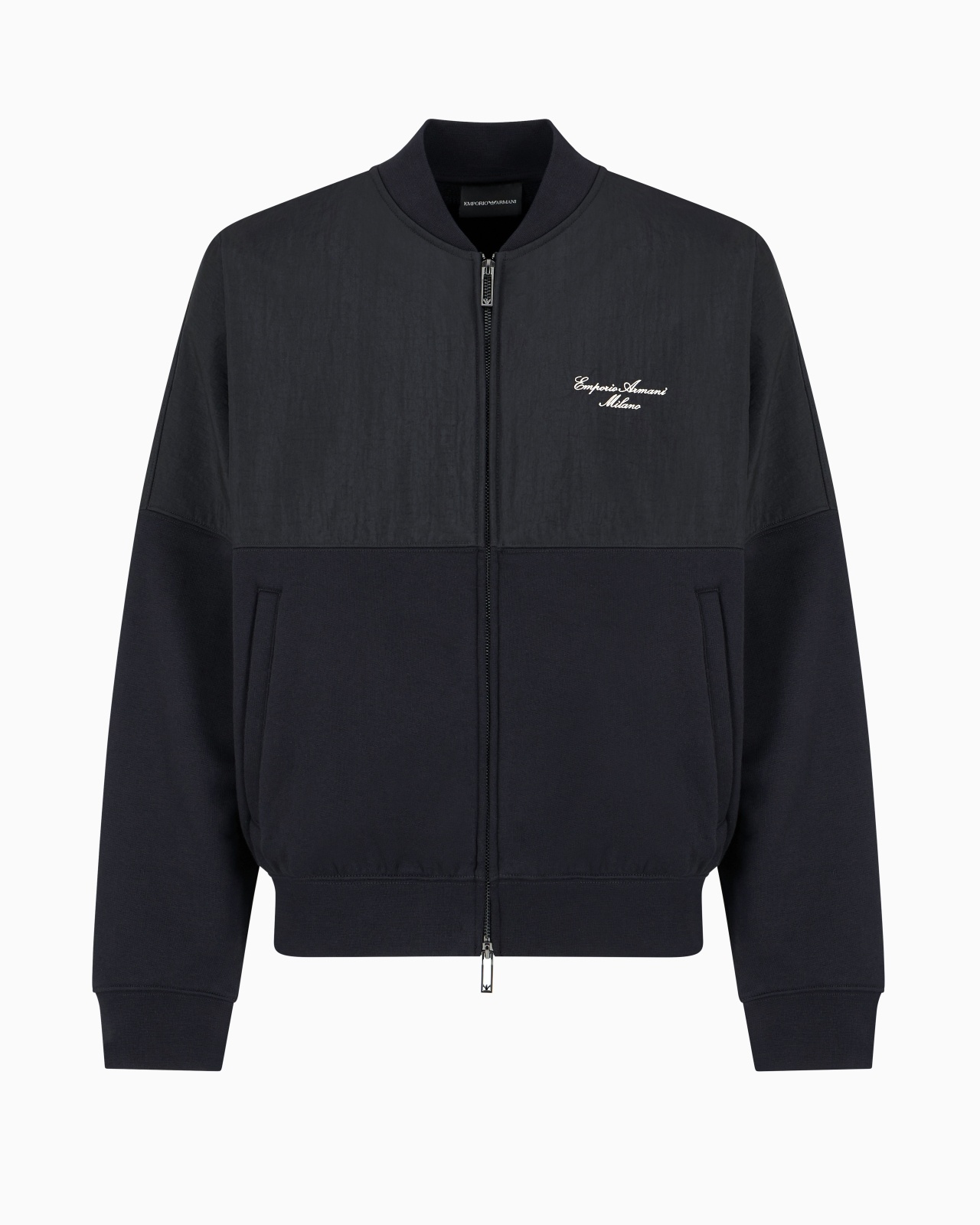 Bomber-collar sweatshirt made of colour-block double fabric: nylon for the upper part and soft pure cotton French terry jersey for the lower part. Emporio Armani Milano embroidery in italics on the chest completes the item with distinction. Nylon for the upper part French terry jersey for the lower part Bomber-jacket collar Zip closure Logo embroidery Side pockets Long sleeves Elasticated trim Brushed lining Product Code: EM001698AF13713UC001