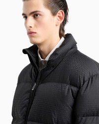 Zipped, hooded down jacket in jacquard nylon with all-over logo lettering