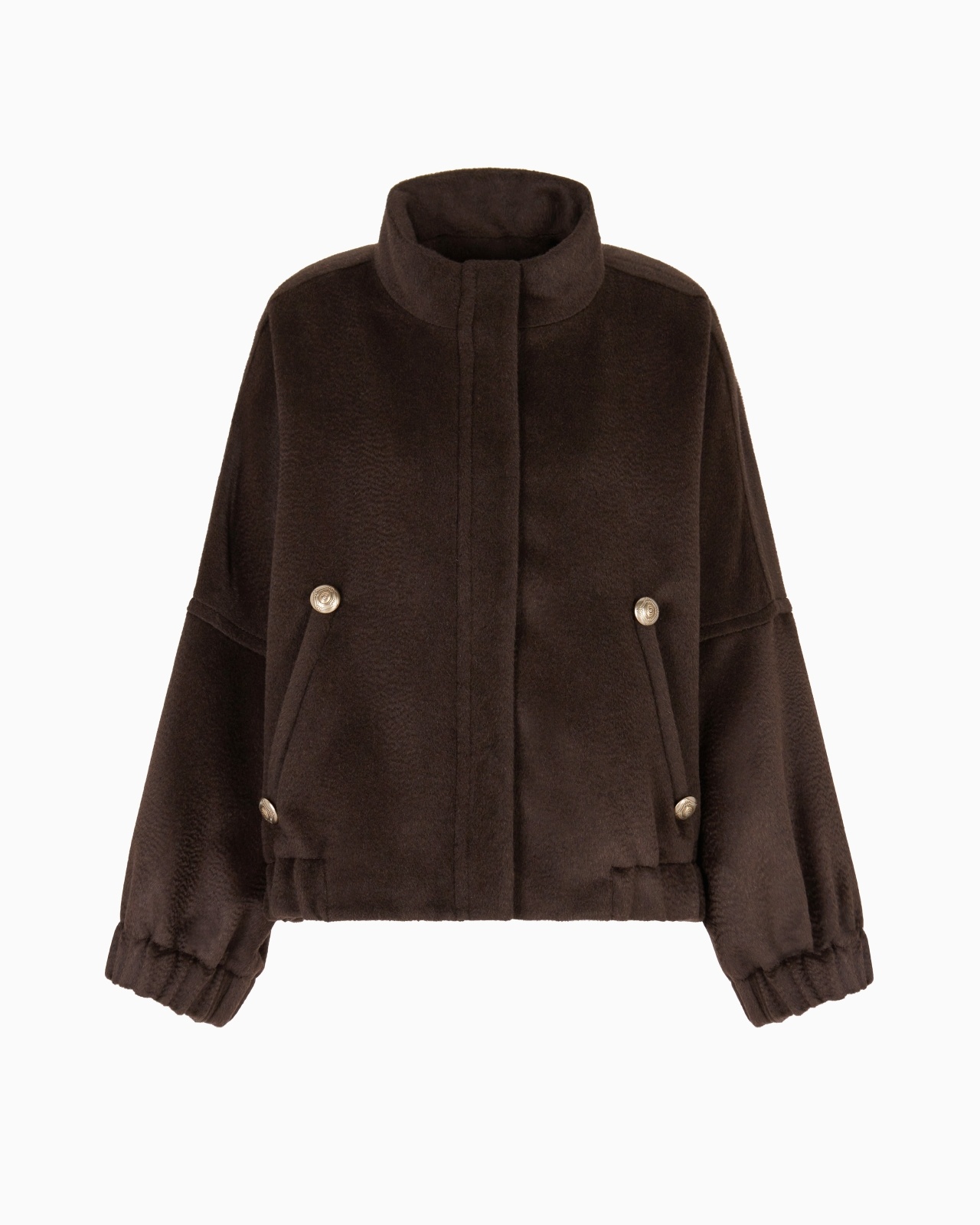 Sophisticated short pea coat made of alpaca and wool with a cosy, warm feel. The style is distinguished by its modern silhouette with oversized volumes, accentuated by wide sleeves and elasticated cuffs and hem. The mock neck and concealed front closure give it a clean, streamlined silhouette, while the exposed metal buttons, which accent the front welt pockets, add a sophisticated touch of light. A versatile, on-trend outerwear piece, perfect for elegantly completing seasonal looks. Upright collar Long sleeves Concealed zip closure Two slant pockets with gold-coloured logo buttons Elasticated cuffs and hem Unlined Length: 60 cm from centre back Made in Italy Product Code: GW001533TE16690U8130