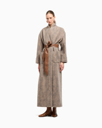 Cosy and enveloping long coat, made of virgin wool from responsible farming and cashmere and embellished with a two-tone chevron motif. A style defined by shawl lapels, patch pockets and a distinctive contrasting leather belt detail, recalling other collection creations. A refined offering, perfect for completing many looks thanks to its clean and versatile line. The piece is part of the New Normal selection, an offering that reinterprets the brand’s archive looks with a modern twist. Pieces in elongated and fluid shapes and with an androgynous flavour dress the feminine silhouette with elegance for day-to-night looks. This season it comes in a natural colour palette animated by a series of chevron motif and houndstooth shapes, a clear reinterpretation of pieces "stolen" from the male wardrobe with a feminine twist. Fabric: 94% wool from responsible farming Shawl collar Fastening with contrasting leather belt Two front patch pockets Sleeve cuffs with turn-ups Central back vent Unlined Length: 130 cm Made in Italy Product Code: GW002314TE16713M6163