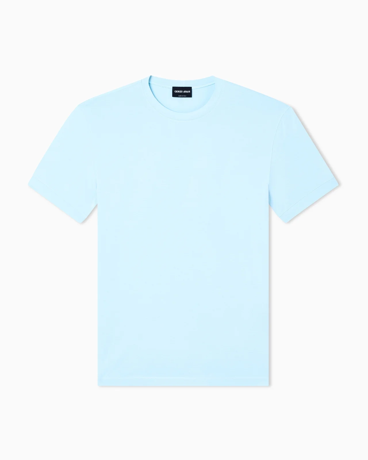 Short-sleeved crew-neck T-shirt made from stretch bamboo-viscose jersey, an iconic fabric of the brand that stands out for its comfortable, cosy feel and perfect fit. Personally chosen and worn by Giorgio Armani as the perfect complement to numerous looks, a hallmark garment of a sleek and highly versatile elegance. Fabric: 90% viscose from responsible forestry Crew neck Short sleeves Rolled, lapped-seam collar and cuffs Made in Italy Product Code: 8NST52SJP4ZU9192