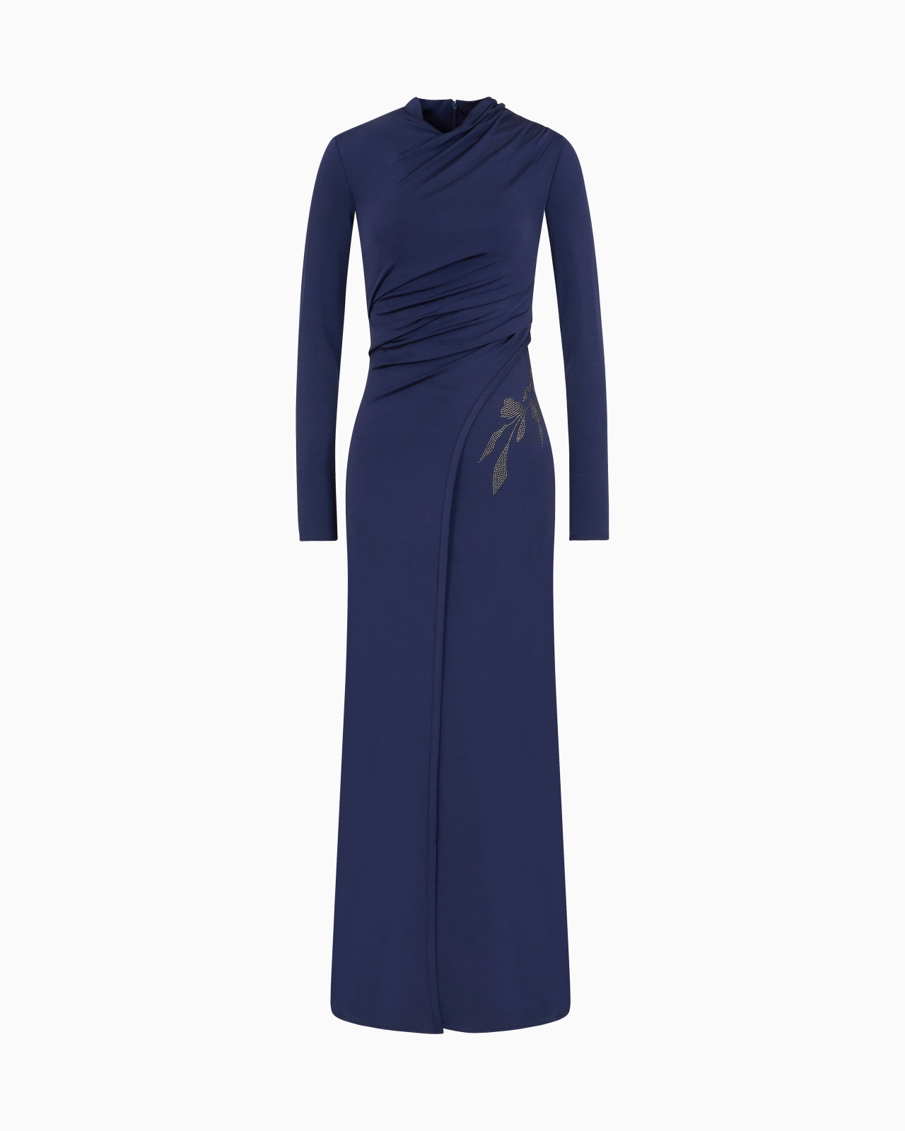 Refined, long dress made from stretch viscose jersey sourced from responsible forestry, that elegantly follows the feminine silhouette. The style features a slightly raised crossover neckline, front draping with a small slit and an exquisite detail on the left side, embellished with a floral motif created from heat-adhesive rhinestones. A sophisticated piece, perfect for special occasions. Product Code: 6DAA65AJZKZ1UBUL Details Composition 98% Viscose 2% Elastane The fabric is made of 98% viscose from responsible forestry Crossover neckline Long sleeves Slight front draping Large front slit Matching floral embroidery on the left side with rhinestones Fitting The model is 178 cm tall and is wearing size 38/S
