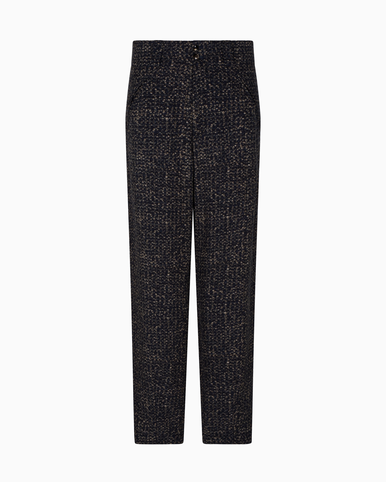 Flat-front trousers in cupro made from recycled cotton by-products, embellished with a knit-effect print. The style, with a waistband with belt loops, button and zip fastening and stitching motif at the hem, which restricts the volume of the piece, is distinguished by its relaxed, effortless attitude. A perfect offering to pair with the matching jacket, creating a casual yet sophisticated business suit. Fabric: 100% cupro from recycled cotton by-products Flat-front trousers Waistband with belt loops Button and zip fastening Two front slant pockets Two back welt pockets Cuff width: 17 cm Made in Italy Product Code: GM002060TE17980M8136