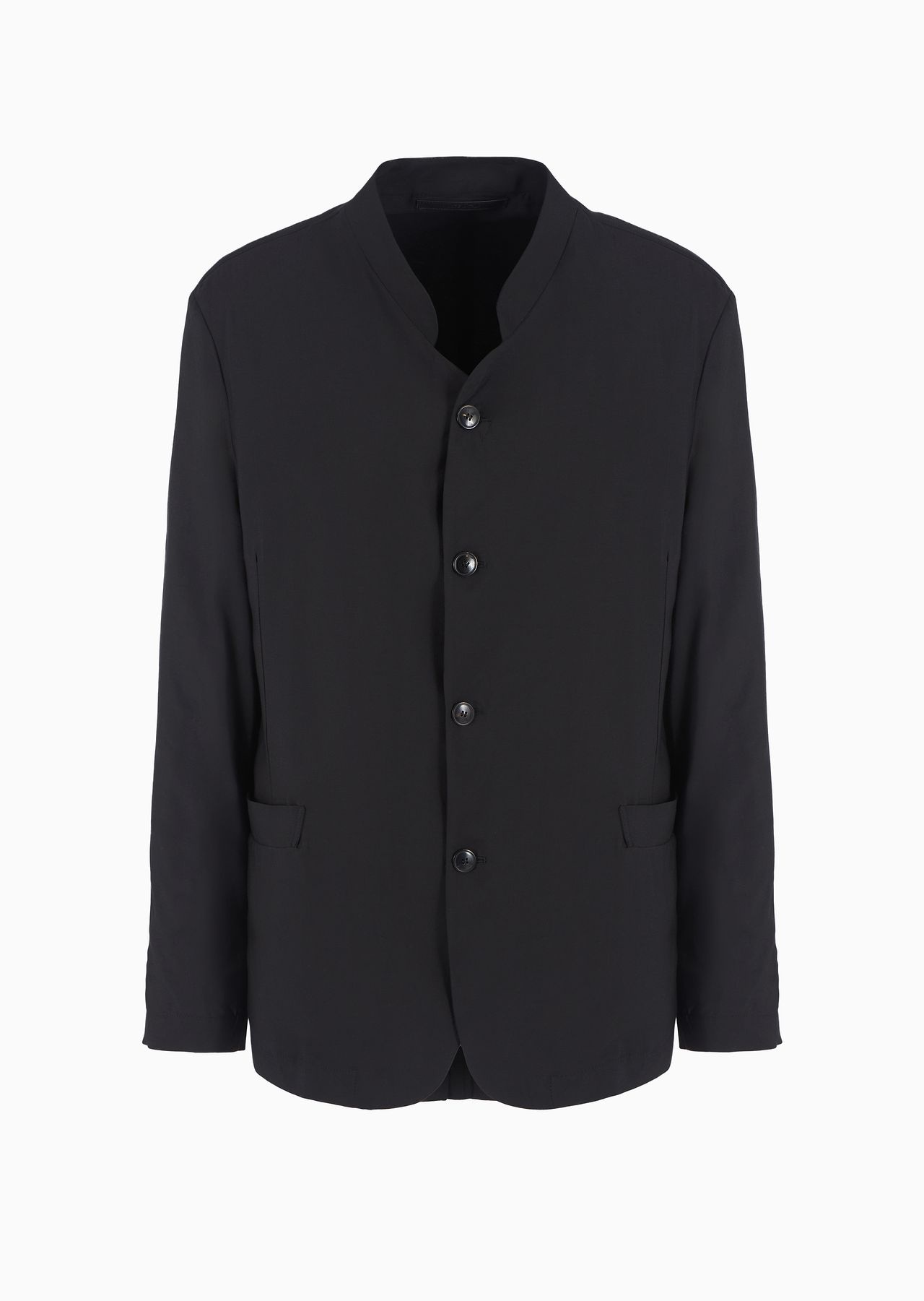 Single-breasted jacket in a lightweight Lyocell and silk canvas with a light feel, in a bright, full-bodied onyx black. Featuring a stand collar, two front pockets and buttoned cuffs, the style captures the laid-back, effortless and casual spirit of the Holiday collection. A piece that interprets a new concept of a jacket, more versatile and relaxed. Product Code: GM000177TE111961UC001 Details Composition 84% Lyocell 16% Mulberry silk Single-breasted jacket Upright collar Two horizontal pockets Single-breasted closure with four buttons Single-button cuffs Unlined Inner pocket Central back vent Made in Italy Fitting The model is 188 cm tall and is wearing size 48 / M