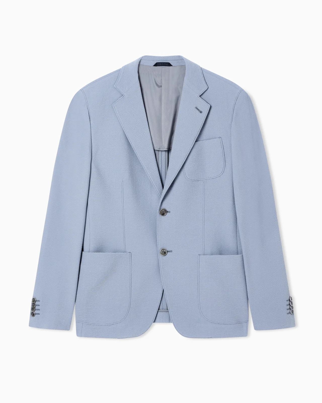 Single-breasted jacket from the Upton Line with a streamlined, completely deconstructed fit: a characteristic that gives the style the iconic fluid lines that are so representative of Giorgio Armani style. This two-button style is made from seersucker virgin wool and features notched lapels, patch pockets and a breast pocket. Fabric: 99% virgin wool from responsibly-managed farms; Lining: 94% cupro from recycled cotton by-products Upton Line jacket Notched lapels Two-buttoned, single-breasted closure Two patch pockets Breast patch pocket Button cuffs Two small internal buttoned pockets Unlined Length: 73 cm Made in Italy Product Code: GM000140TE14497U8062