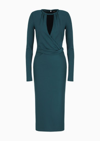 Sleek, refined midi dress, featuring a slim fit that accents and enhances the silhouette. Crafted from a viscose blend made with natural-origin artificial fibres obtained from responsible forestry, the style is enhanced by a front keyhole detail on the neckline and draping at the waist, creating a belt effect that accentuates the waistline. This sophisticated style can be worn for day or evening looks, simply by changing accessories. Product Code: 6DAA68AJFBZ1UB2X Details Composition 71% Viscose 24% Polyamide 5% Elastane The fabric is made of 71% viscose from responsible forestry Stand collar Front teardrop opening Long sleeves Gathered detail on front Belt-effect draping on the waist Back central zip fastening Central back vent Length: 122 cm Made in Italy Fitting The model is 178 cm tall and is wearing size 38/S