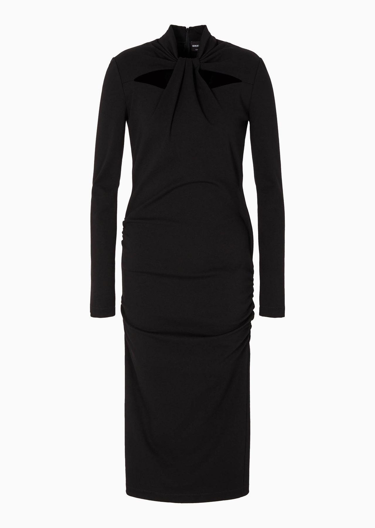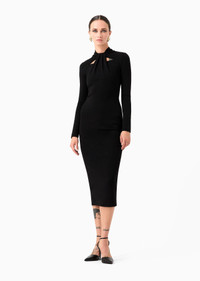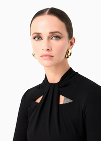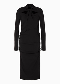 Sleek, refined midi dress, featuring a slim fit that accents and enhances the silhouette. Made of a stretch viscose blend in a Milano stitch, it is embellished with a pleated motif on the bodice and cut-out detail on the neckline. This sophisticated style can be worn for day or evening looks, simply by changing accessories. Product Code: 6RAA56AJFBZ1UC99 Details Composition 71% Viscose 24% Polyamide 5% Elastane Upright collar Knotted cut-out detail on the front Long sleeves Ruched sides Back central zip fastening Length: 116 cm Made in Italy Fitting The model is 178 cm tall and is wearing size 38/S Italian Size