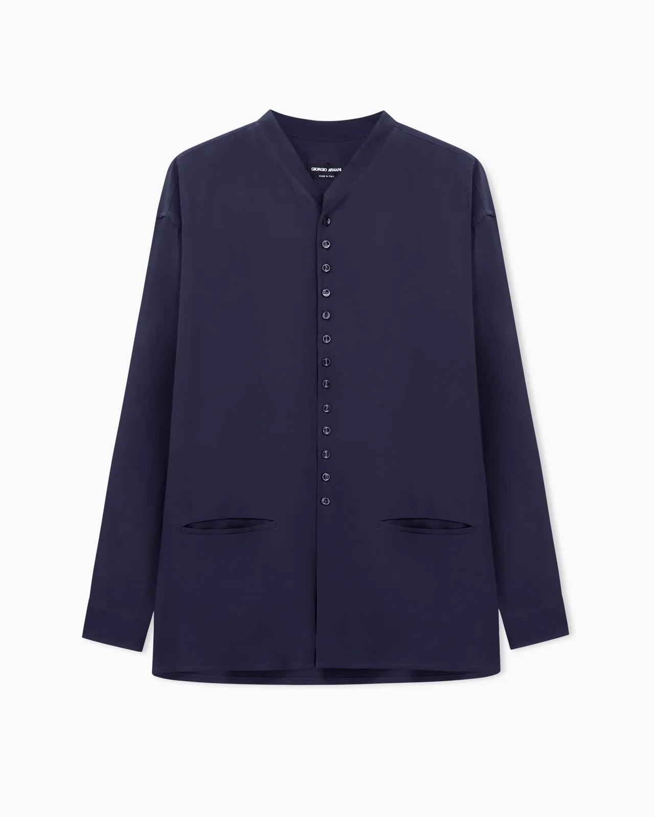 Special shirt featuring a guru collar and visible button closure, made of washed silk. A style with relaxed lines that lends itself to completing sophisticated looks. Fabric: 79% organic silk V neck Front closure with 16 mother-of-pearl buttons Two small welt pockets Single-buttoned cuffs Rounded hemline Back yoke Length: 88 cm Made in Italy Product Code: GM003502TE10081UB102