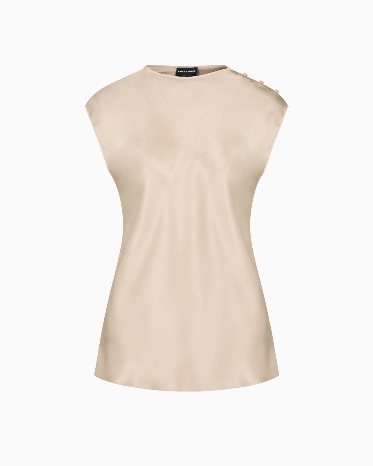 Elegant blouse made of double silk satin, featuring a slinky, relaxed fit. With a slightly stand collar and cap sleeves, the style is embellished with a small contoured panel detail on the left shoulder, which can be worn on the front or on the shoulder. A versatile item that perfectly complements the collection's trousers and skirts. Slight upright collar Cap sleeves Small contoured panel detail on shoulder, press-stud closure Made in Italy Product Code: GW000686TE10101U8048