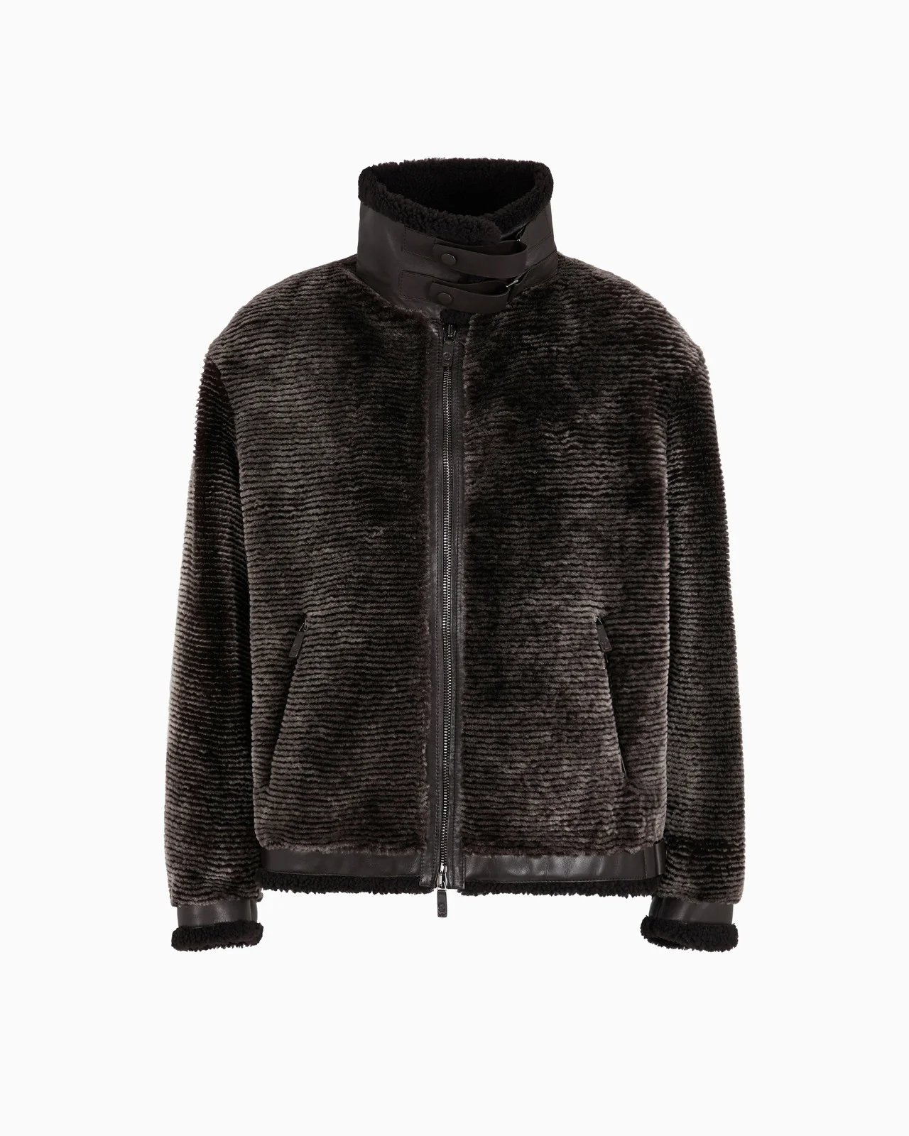 Distinctive blouson with comfortable volumes, made of luxurious lamb shearling. The sophisticated workmanship, which involves the lightening and subsequent lasering of the skin, creates a sculpted and iridescent effect. The garment's details, such as the straps and trims made of lambskin nappa leather, and the curly shearling edges embellish this sophisticated style, in which every detail is carefully thought out. A zip-up closure, welt pockets and a stand collar with straps complete the piece, perfect for finishing many winter looks. Comfort fit Shirt collar with nappa leather adjusters Double-slider zip closure Two zipped side pockets Nappa-leather trims Adjustable nappa leather straps Bonded shearling collar, cuffs and hem Lined in stretch satin with embroidered oversized GA logo Two buttoned inner pockets Length: 68 cm Made in Italy Product Code: GM000455AF12237U6028