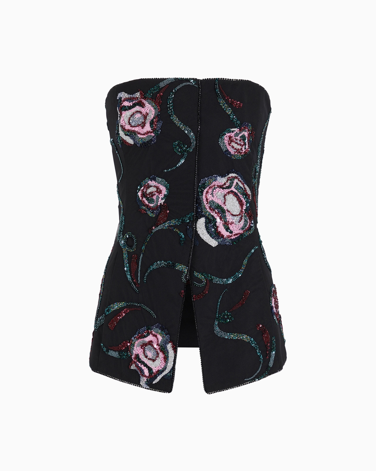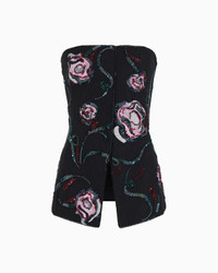 This exquisite bustier top is defined by an elegant and sophisticated shimmer, and its essential, almost geometric line is highlighted by black crystal piping. The style is lit up by a lightweight layer of tulle embellished with rich floral embroidery, created with multicoloured beads, sequins and jet beads. A special piece, the result of expert Made in Italy artisanship, an example of the brand’s expertise in creating unique embroidery with a distinctive charm. Removable shoulder straps Back concealed zip closure Heat-sealed black crystal piping Layer in tulle embroidered with a floral motif created from multicoloured sequins, baguettes, beads and rhinestones Silk lining Internal stays Length: 45 cm Made in Italy Product Code: GW000439AF12236ZZ017