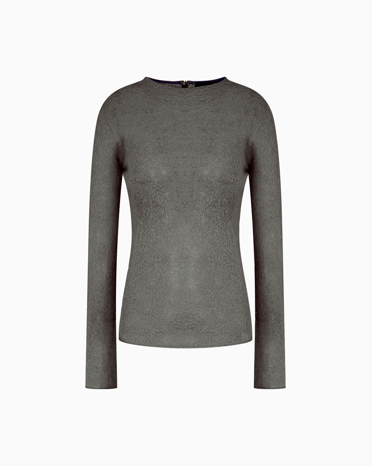 Distinctive, slim-fitting crew-neck jumper made from cosy cashmere and mohair wool. The style is characterised by its sophisticated openwork stitch, which enhances the softness of the yarn, also creating a delicate play of transparency. A versatile piece offered in staple shades. Fineness: 12 Crew neck Long sleeves Back central zip fastening Made in Italy Product Code: GW000895AF14924U8119