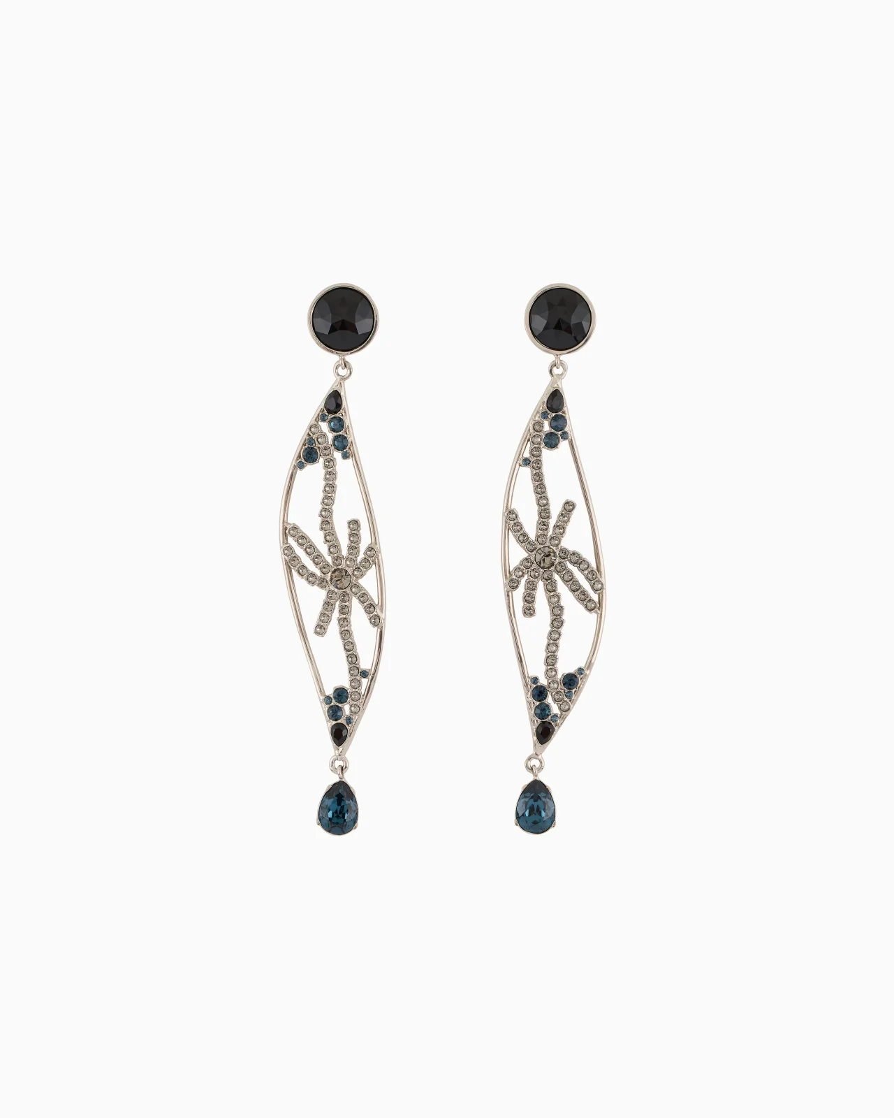 Bright pendant earrings, made of brass and illuminated with multicoloured Swarovski crystals, echoing the shades of the ready-to-wear selection. A special accessory that lights up the face and completes evening looks.<br>The accessory is part of the exclusive collection that celebrates the connection between Giorgio Armani and the world of Hollywood. A colour palette of deep blues combines with a profound and ever-elegant black, to create a sparkling, luxurious selection inspired by the limelight and most exclusive Hollywood parties. Extremely sophisticated pieces with iconic lines are made of velvets, silks and satins enlivened by crystal and rhinestone embellishments and refined workmanship. Looks for him and her, designed for evenings and special occasions. Clip fastening Black crystal cabochon Brass and tin pendant with multicoloured Swarovski crystal appliques Blue teardrop pendant Made in Italy Product Code: GW001616AF17845U9138