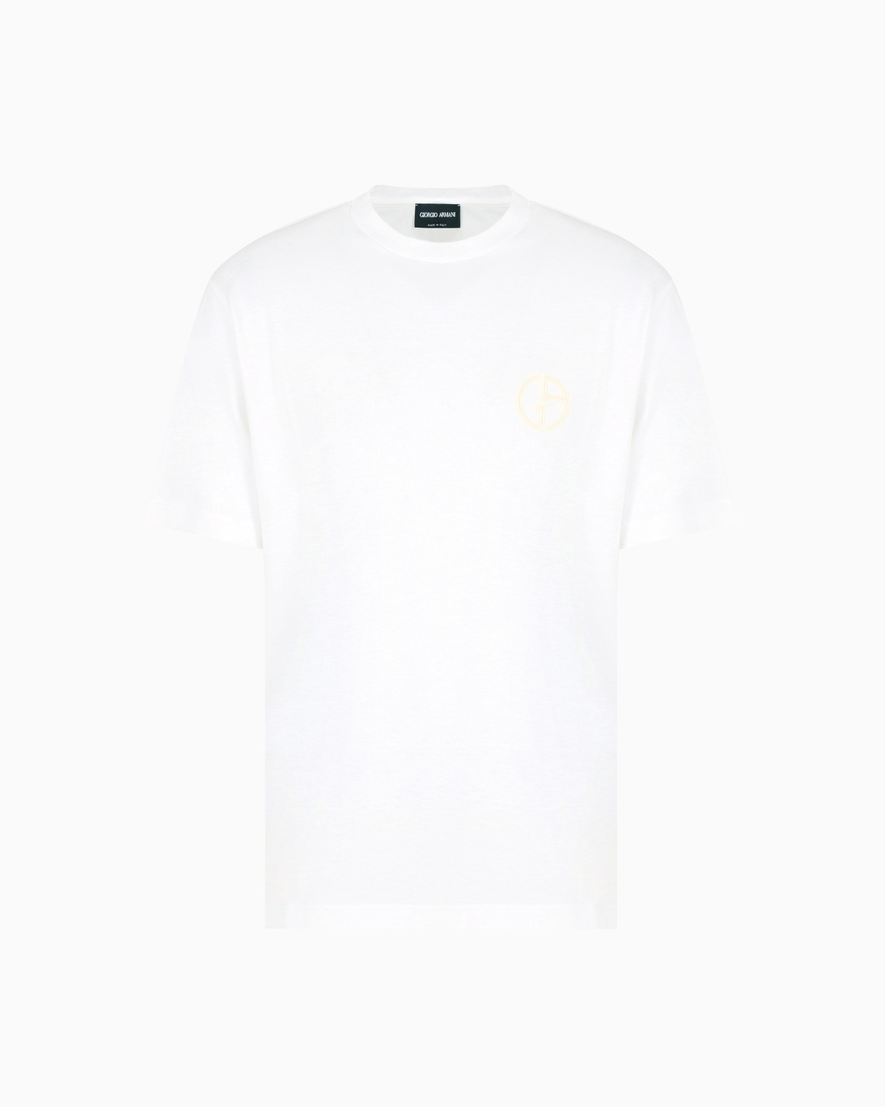 Crew-neck T-shirt made from cosy, comfortable pure cotton interlock with a relaxed feel and minimalist design. The style has short sleeves and a matching embroidered GA logo. A versatile garment that adapts to different looks, completing them with the enduring Giorgio Armani style. Product Code: GM000240TE106291U0002 Details Composition 100% Cotton Regular fit Crew neck Short sleeves Matching topstitching-effect embroidered GA logo on the chest Made in Italy Fitting The model is 188 cm tall and is wearing size 48 / M