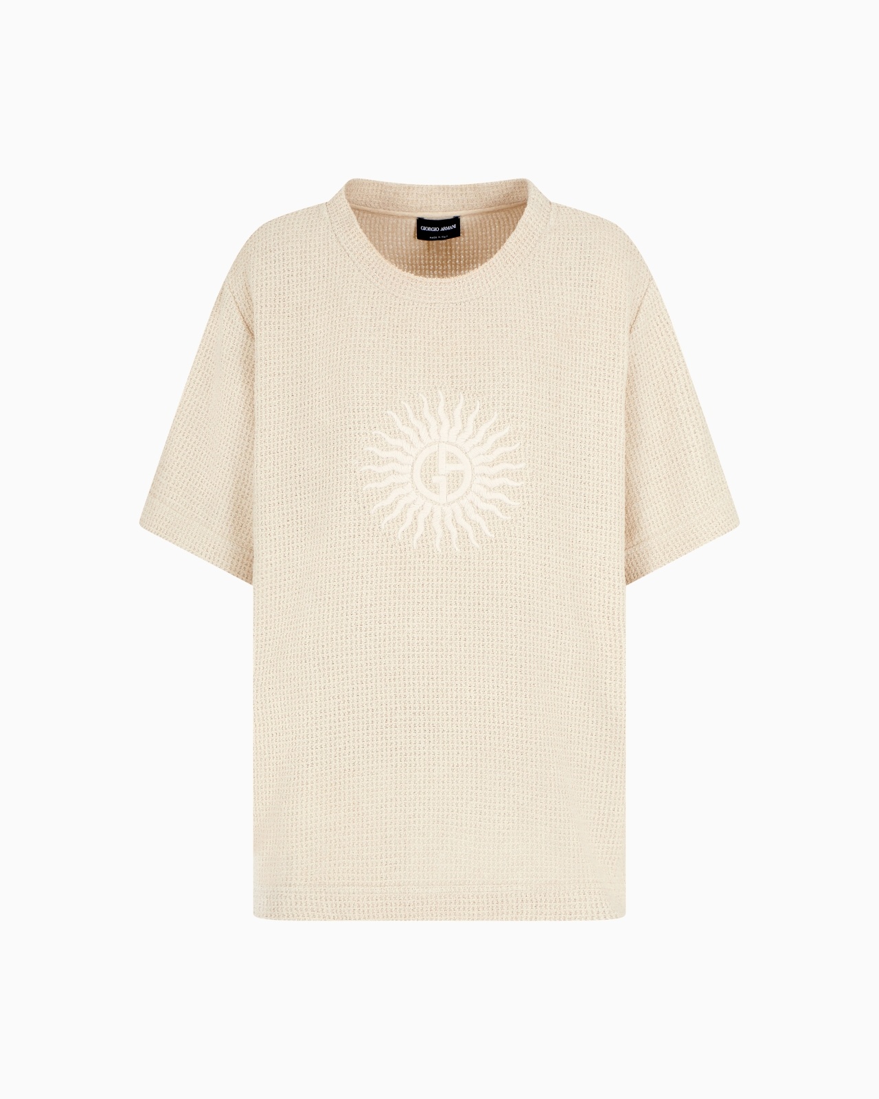 Relaxed-fit T-shirt made from a mesh-effect cotton blend, embellished with GA logo embroidery on the front. The versatile style can be paired with denim jeans or trousers for a laid-back look. The piece is part of the Denim Collection, which interprets the world of denim through the brand’s iconic style. Silky-soft yarns and a versatile colour palette: denim is seen in a whole new light, as more feminine and luxurious. Crew neck Short sleeves Front embroidery with GA logo Made in Italy Product Code: GW001111AF15498U1089