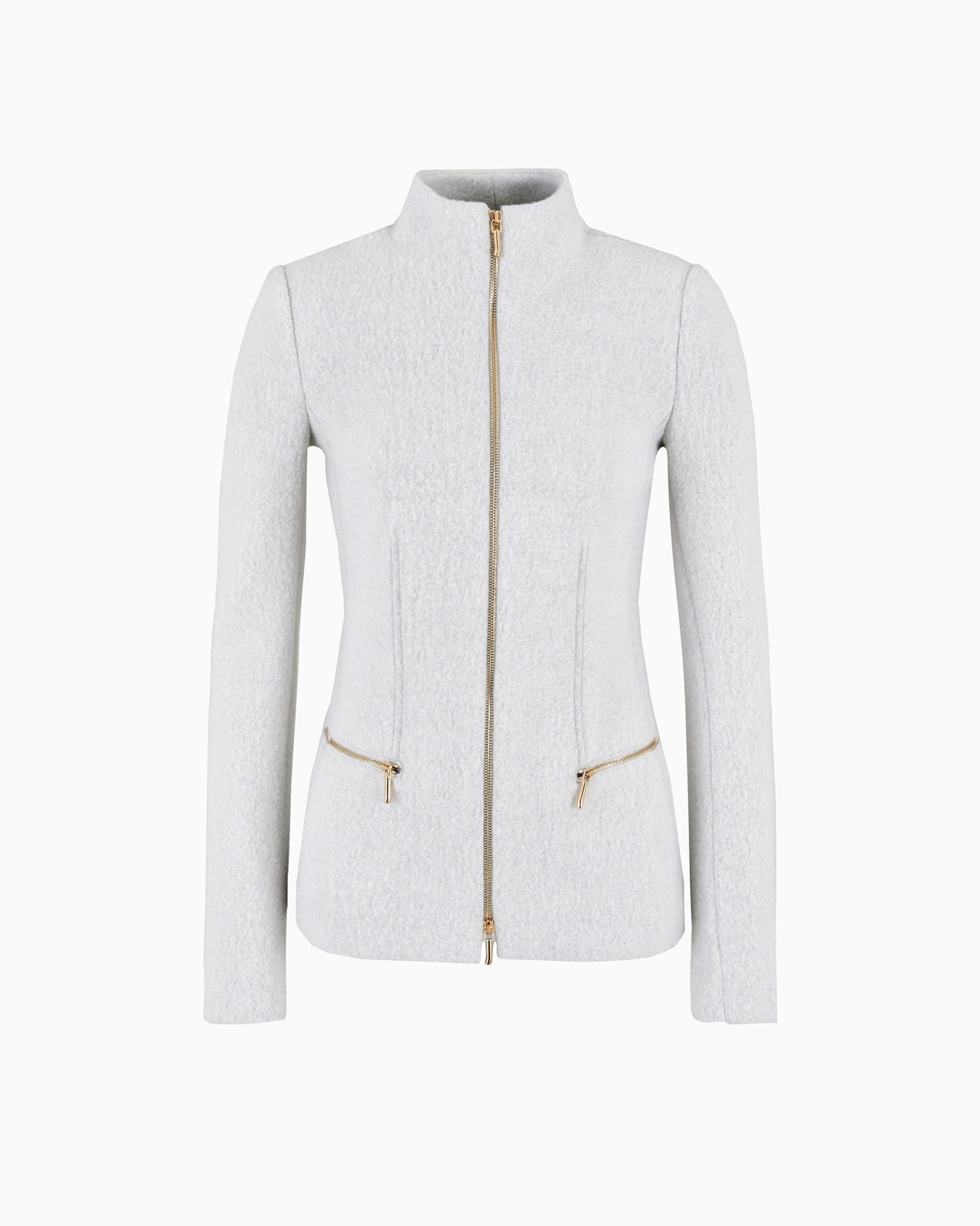 Slimline zipped jacket made of cotton, wool and cashmere double cloth. The style elegantly drapes over the silhouette and features a front zip closure, small upright collar and two front zipped pockets. The front rib detail accentuates the waist, elongating the silhouette. A sophisticated style designed to complete evening looks. Product Code: 6DAG65AJZVZ1U0N8 Details Composition 50% Cotton 42% Wool 8% Cashmere Upright collar Front zip closure with double pull tabs Two horizontal pockets with zip Monochromatic stitching detail Length: 60 cm Made in Italy Fitting The model is 178 cm tall and is wearing size 38/S