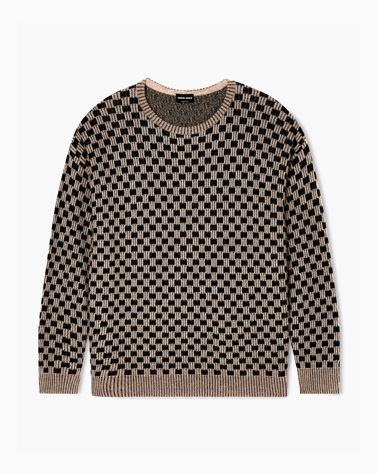 A sophisticated jacquard embellishes the smooth, comfortable lines of this crew-neck jumper, which is crafted from a blend of cashmere and silk. Defined by ribbed trims and enlivened by a two-tone check motif, the style lends itself to relaxed looks, perfect for leisure time and casual events. Fineness: 12 Crew neck Long sleeves Check two-tone jacquard Ribbed hem, cuffs and collar Made in Italy Product Code: GM002184AF20317FC006