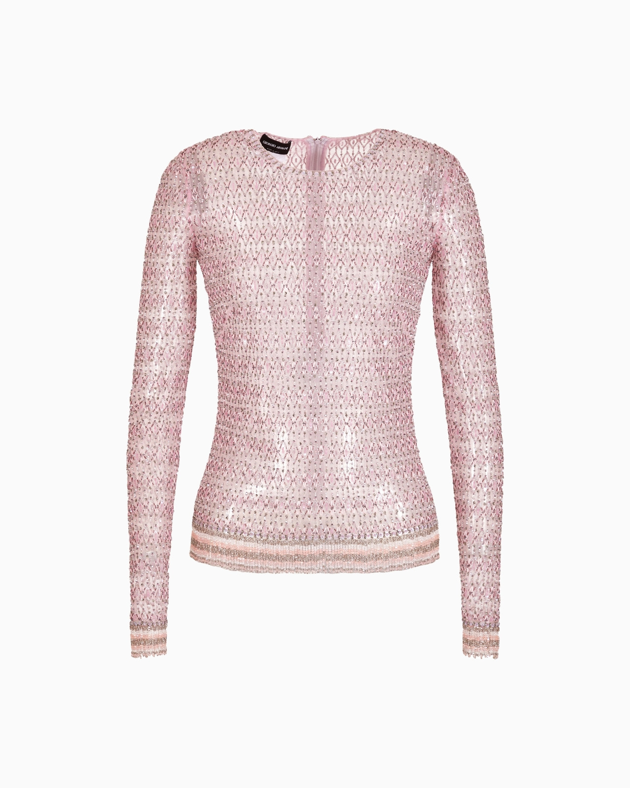 Dazzling crew-neck jumper made of tulle, featuring ornate embroidery with multicoloured micro baguettes that create a geometric motif. The minimalist style has an invisible zip fastening at the back, and the fringed motif creates movement at the hem and cuffs. A distinctive, exquisite piece, perfect for bringing light and elegance to evening looks. Product Code: 4SHCR06HT04U71PZ01 Details Composition 100% Polyamide Crew neck Long sleeves Tulle base with matching silk thread and silver lurex embroidery with pink and silver micro baguette-cut beads and pink opals Pink and grey crystal fringe motif on the hem and cuffs Back concealed zip closure Made in Italy Fitting The model is 178 cm tall and is wearing size 38/S
