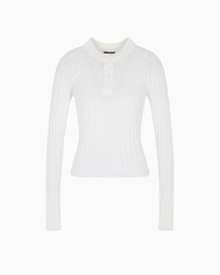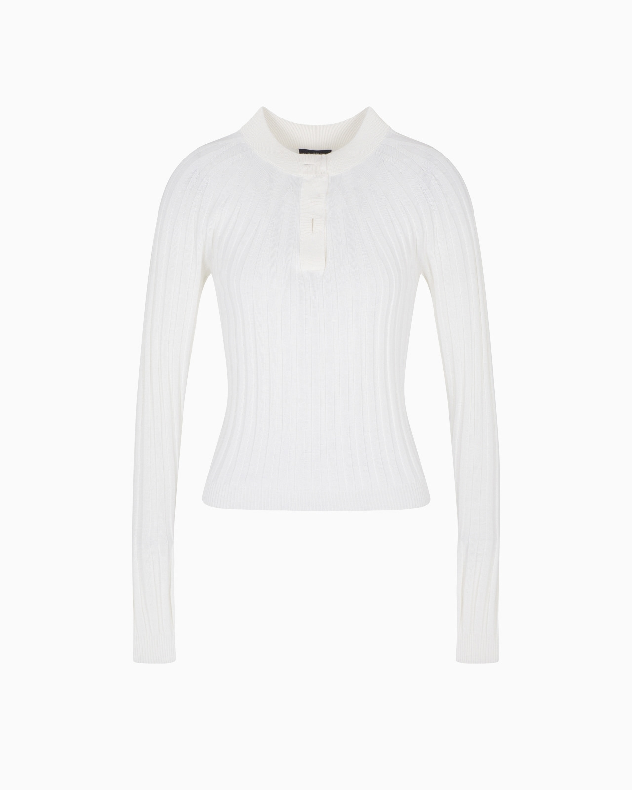 Crew-neck jumper made from soft cashmere and silk that elegantly adorns the feminine silhouette. Featuring a seamless construction, the style is embellished with a ribbed motif that gives the garment a three-dimensional look, and is designed to complete laid-back daytime looks.<br>The garment is part of the Holiday selection, which plays with a minimalist colour palette of black and white, colours that have always been a symbol of sophistication. A colour choice found in the fabrics, embroideries and accessories that express the essence of Armani spirit, distinguished by clean, androgynous-inspired lines, that are still always feminine and sensual. Fineness: 18 Seamless Ribbed Round neckline with one-button closure One-button placket Long raglan-style sleeves Made in Italy Product Code: GW001814AF18784U0002