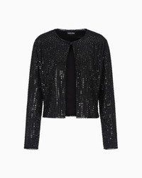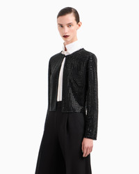 A luminous shower of black rhinestones illuminates and embellishes the clean lines of this silk satin shirt. Featuring a deep round neck and concealed hook closure, this style elegantly dresses the feminine silhouette, making it the star of sophisticated, special looks that are perfect for the evening.<br>The garment is part of the Holiday selection, which plays with a minimalist colour palette of black and white, colours that have always been a symbol of sophistication. A colour choice found in the fabrics, embroideries and accessories that express the essence of Armani spirit, distinguished by clean, androgynous-inspired lines, that are still always feminine and sensual. Crew neck Long sleeves Concealed hook closure Fully embroidered with hand-applied matching round rhinestones Lined Made in Italy Product Code: GW001831AF20122ZZ017