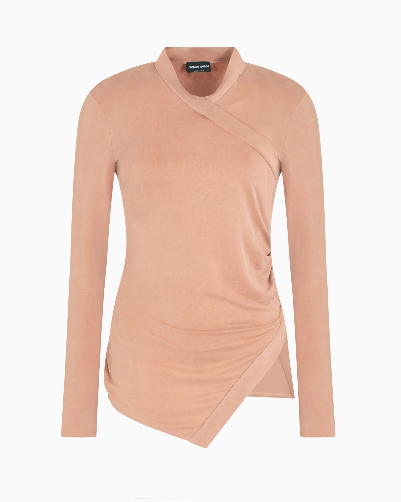Long-sleeved jumper made of cupro jersey, defined by the asymmetric effect created by the diagonal front panel. A silky, comfortable style to wear that follows the female silhouette without restrictions. A perfect piece to pair with the collection’s trousers. V neck Long sleeves Diagonal front panel Made in Italy Product Code: GW000912AF15057U6090