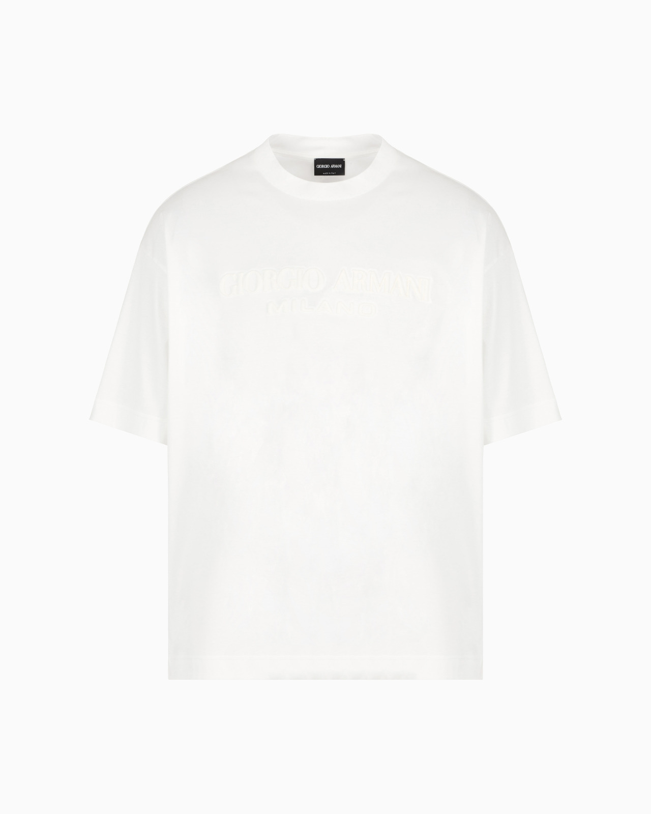 Oversized T-shirt made of cosy cotton, customised by the Giorgio Armani Milano logo created with a monochromatic domed effect. A selection with a modern attitude, perfect for relaxed looks suitable for leisure time. The garment is part of the Denim collection, an apparel selection featuring rich blue denims and relaxed sportswear-inspired shapes that offer laid-back but sophisticated style. Oversized fit Crew neck Short sleeves Embossed Giorgio Armani Milano logo on the chest Made in Italy Product Code: GM000315AF16511U0009
