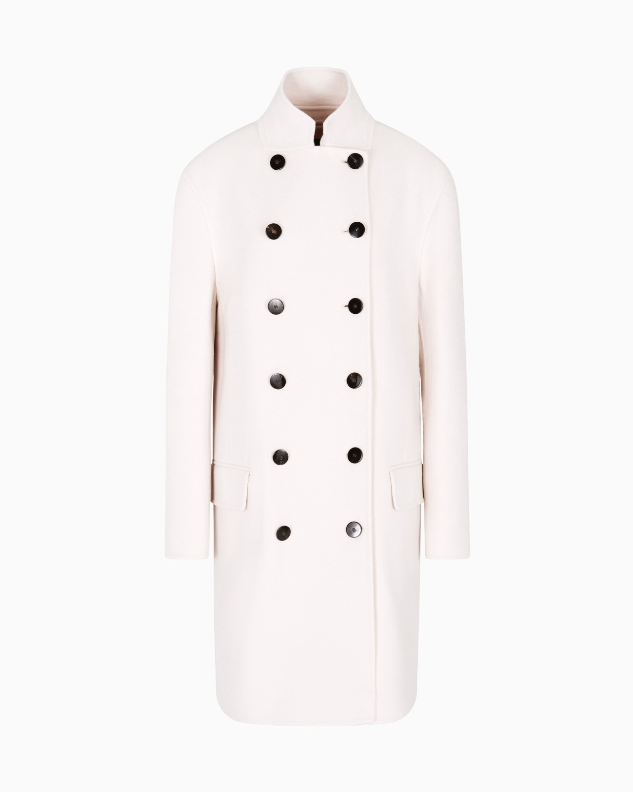 Double-breasted coat made of cosy, warm cashmere double cloth, with a clean, essential construction. The style features a stand collar, exposed button placket, flap pockets and a vent at the centre back that adds slight movement to the volume. A versatile offering, designed to embellish numerous looks, perfect for day or evening. The piece is part of the New Normal selection, an offering that reinterprets the brand’s archive looks with a modern twist. Pieces in elongated and fluid shapes and with an androgynous flavour dress the feminine silhouette with elegance for day-to-night looks. This season it comes in a natural colour palette animated by a series of chevron motif and houndstooth shapes, a clear reinterpretation of pieces "stolen" from the male wardrobe with a feminine twist. Stand collar Double-breasted six-button closure Two flap pockets Central back vent Double style Length: 94 cm from centre back Made in Italy Product Code: GW001897TE10112U1029