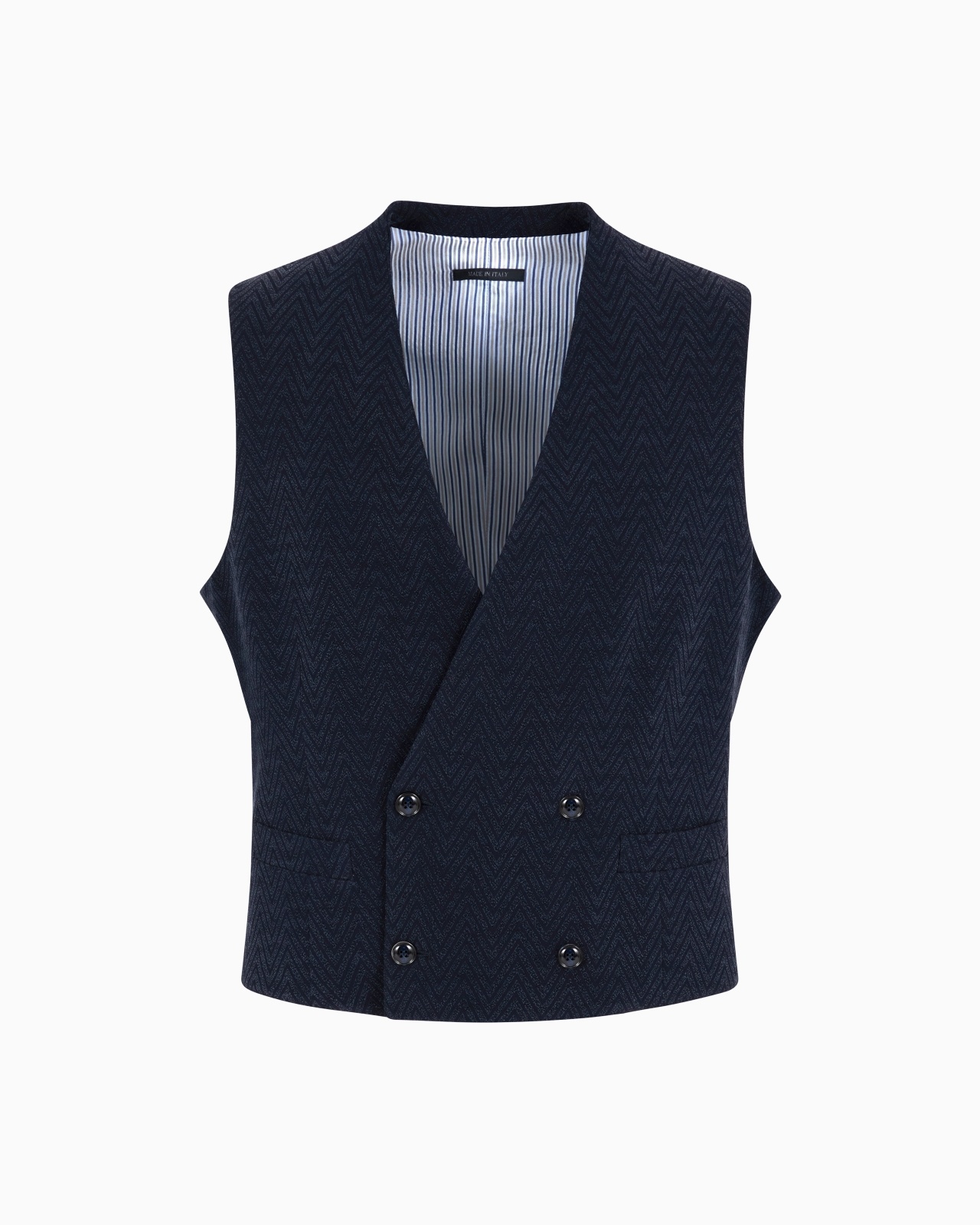 Elegant waistcoat made from virgin wool and silk with a pin point pattern, designed to add a sophisticated touch to the entire look. Defined by double-breasted buttoning, it has a V neckline with no lapels and welt pockets. Double-breasted waistcoat V neck Two small welt pockets Back strap Lined Length: 57.5 cm Made in Italy Product Code: GM000509TE14380UB114