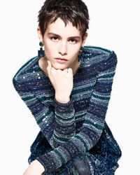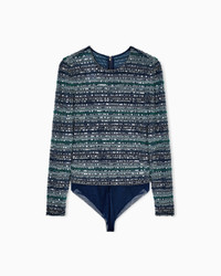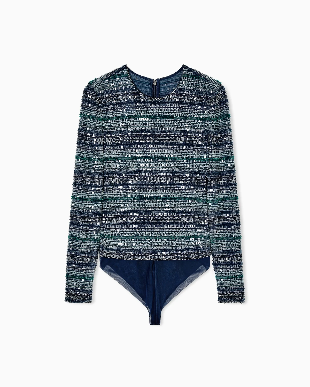 Shimmering, sensual bodysuit completely embroidered with a horizontal stripe motif crafted in beads of different sizes, in shades of blue, light blue, green, white, silver and teal, alternating with transparent sequins. The crew-neck style features a comfortable zip closure on the back and long sleeves. A style that won’t go unnoticed as it embodies the unmistakable feminine elegance of Giorgio Armani. Crew neck Long sleeves Centre-back zip fastening Handcrafted horizontal striped embroidery with beads and sequins Made in Italy Product Code: GW003011AF24554ZZ017