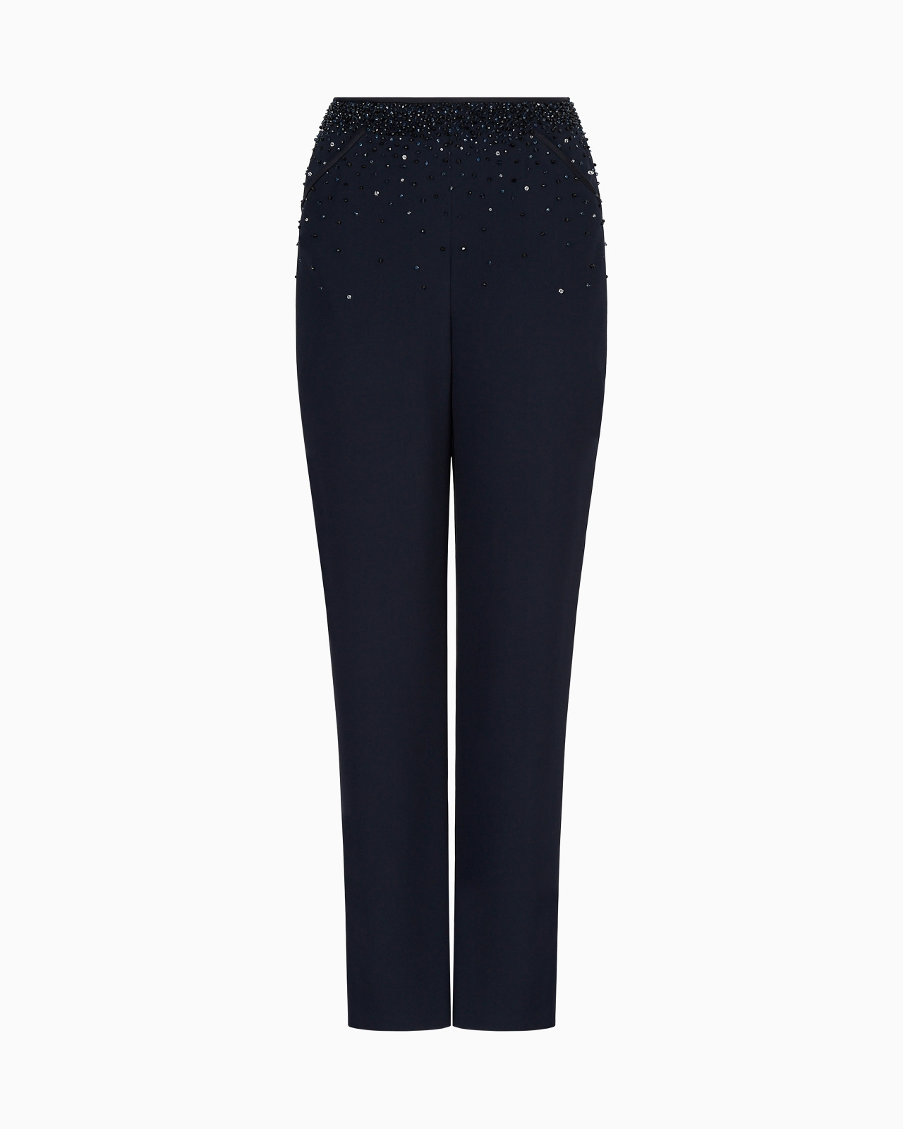 A shower of bright black and blue crystals and jais beads creates gradient embroidery that embellishes the front of these stretch cady straight-cut trousers. The style has a slim fit that drapes elegantly over the silhouette and features a concealed zip closure and two side pockets. A sophisticated, exquisite style designed to make evening looks shine. Product Code: 2WHPR013T03PG1PZ01 Details Composition 96% Viscose 4% Elastane Gradient embroidery from the waistband to the hips made of black and blue crystals and jais beads Two side welt pockets Lined Made in Italy