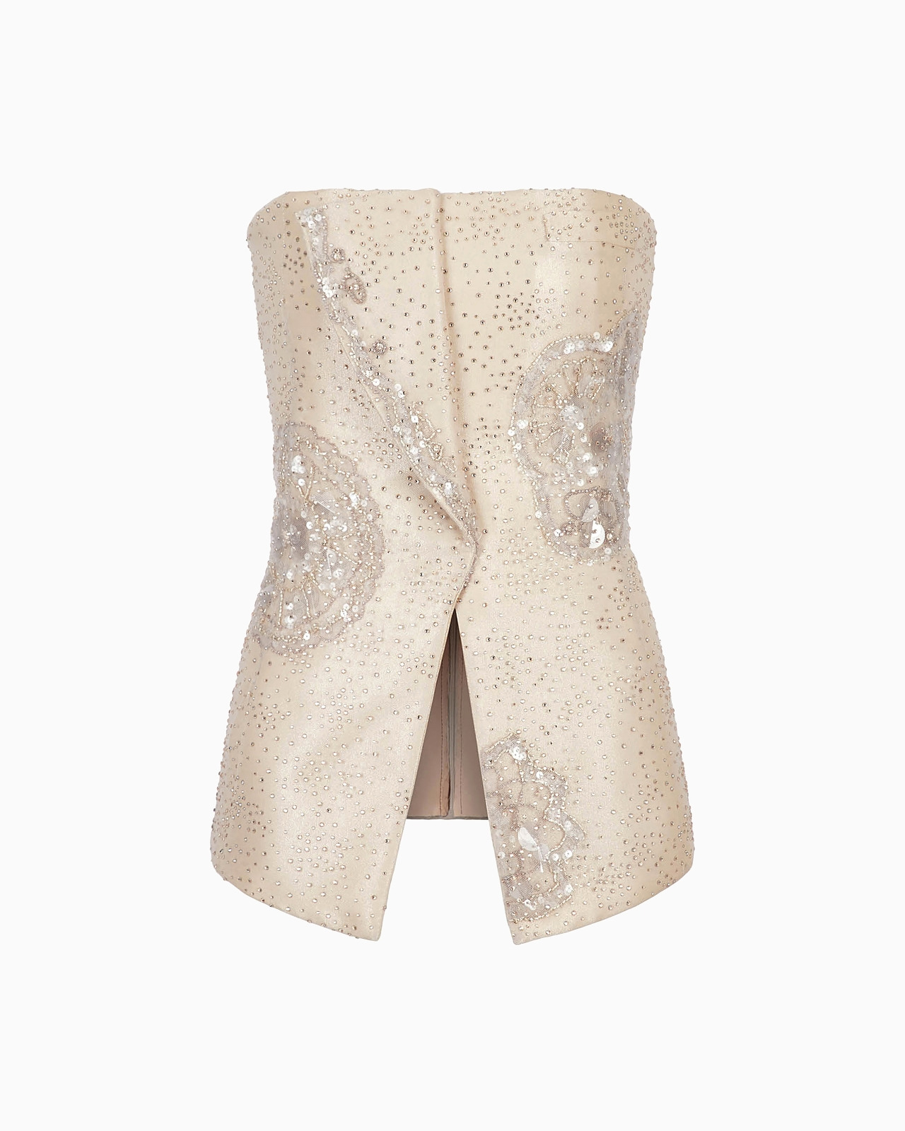 This exquisite bustier top is defined by a delicate, sophisticated light. The style is illuminated by a lightweight layer of tulle, embellished with two-toned heat-adhesive crystals, combined with rich, mandala-motif embroidery, created with matching beads, sequins and jais beads. A special piece, the result of expert Made in Italy artisanship, an example of the brand’s expertise in creating unique embroidery with a distinctive charm. Made in Italy Upper body length: thigh_length Upper body clothing type: Top Weight: 0.2 Kilogram Product Code: 3SHCK01XT04EUPZ01