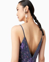 Ethereal, romantic appeal for this elegant long dress that plays on transparencies and overlays. Featuring pure, clean lines, it is opulently embroidered with sequins, crystals, baguette beads and multicoloured beads to create a statement floral motif. A sophisticated, elegant piece of expert Italian artisanship that is sure to turn heads. Product Code: 3SHVR05ET046T1PZ01 Details Composition 100% Mulberry silk Thin shoulder straps with heat-sealed crystals V neck All-over floral embroidery created with sequins, crystals, baguette beads and multicoloured beads Gathered waist Heat-sealed crystal piping Back central zip fastening Made in Italy